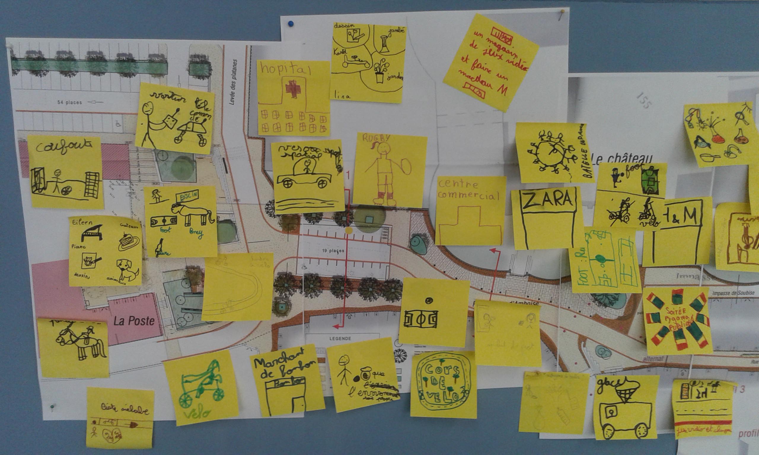 L’objectif de l’atelier pédagogique est de permettre aux enfants de s’approprier les enjeux du projet d’aménagement du centre-bourg dans ses usages et sa conception. L’atelier s’est déroulé en plusieurs temps : représentation sensible du centre-bourg et la manière dont les enfants utilisent les espaces, présentation du projet d’aménagement du centre-bourg (découverte et commentaires sur la maquette, le système d’acteurs du projet, le processus de projet, lecture de l’avant-projet détaillé) et un temps d’expression « un centre-bourg pour les enfants, quel futur désiré ? »