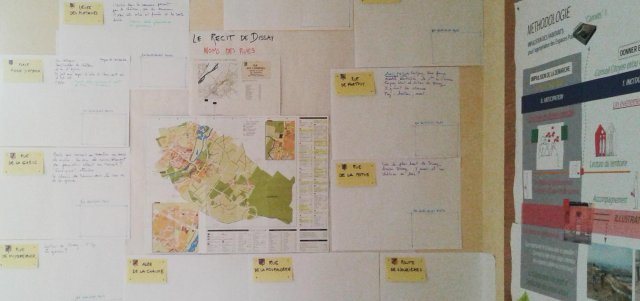 Dans le cadre des propositions de la maîtrise d’œuvre du projet de centre-bourg, il a été suggéré par Isabelle Quidet (scénographe) de refaire quelques plaques de rue en intégrant des explications à caractère historique sous les noms. Via la mission participative, les habitants sont associés à l’explication des noms de rue. Fin 2018, didattica associe aussi un écrivain (Christian Caro) à la démarche afin de transposer les témoignages en textes « littéraires ».