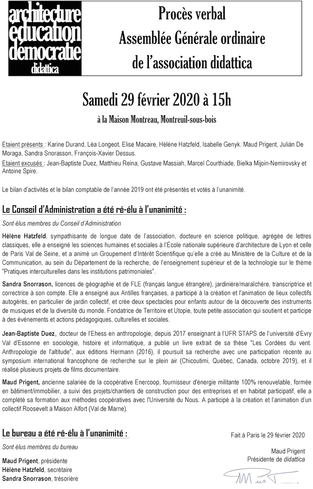 Le bureau a été ré-élu à l’unanimité. Sont élus membres du bureau :