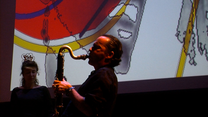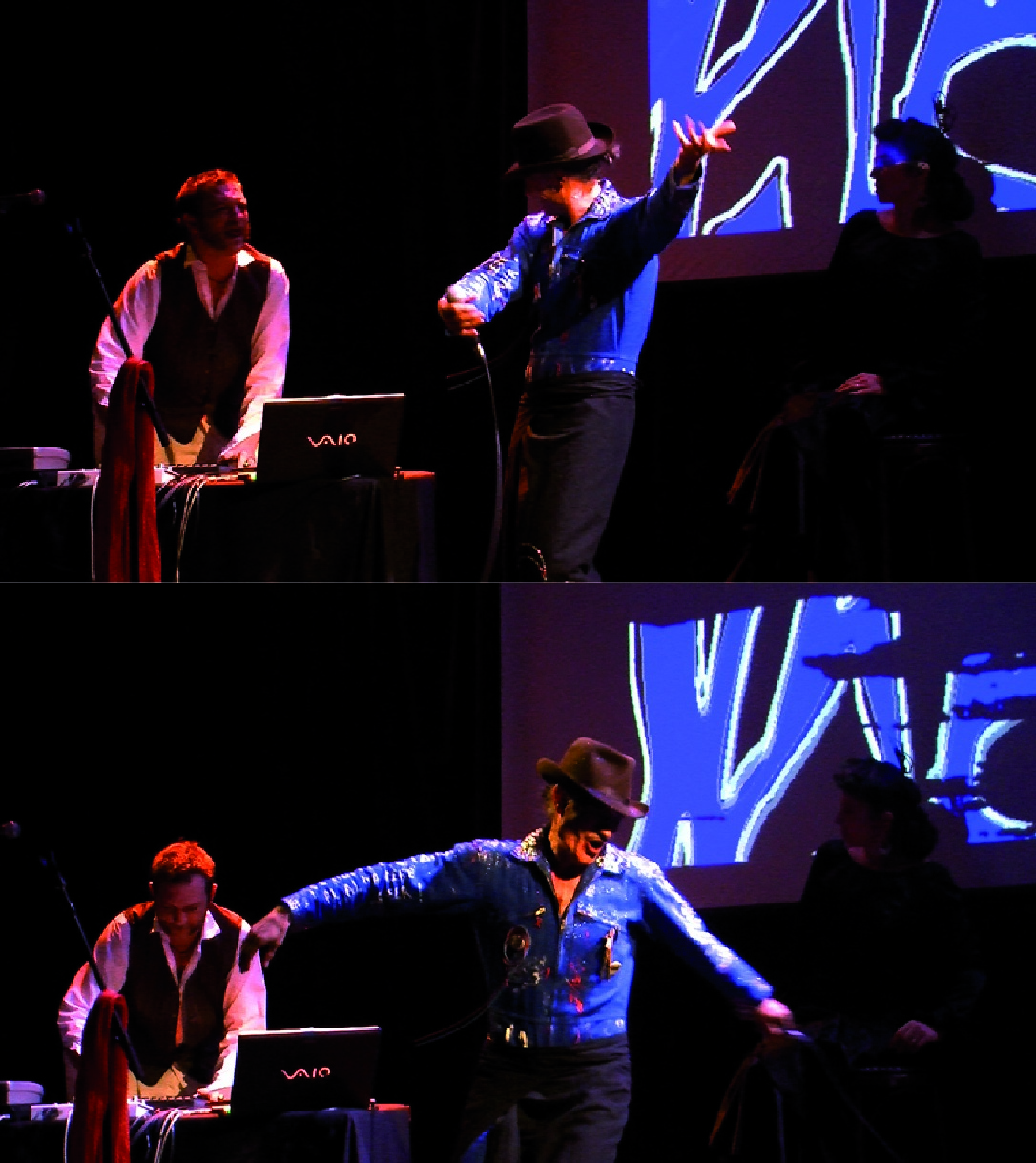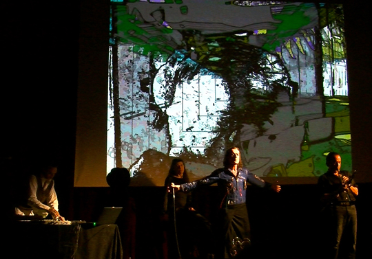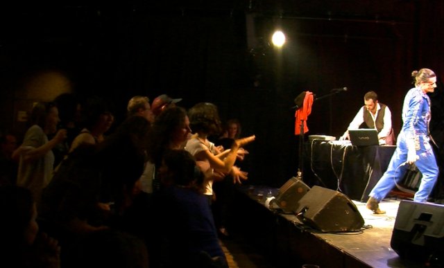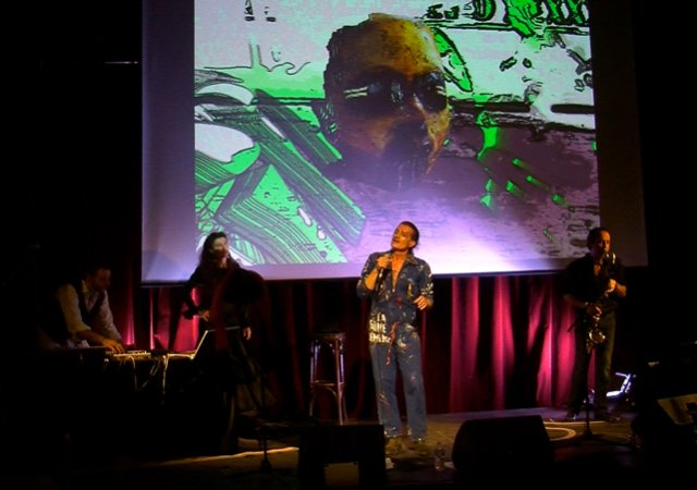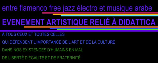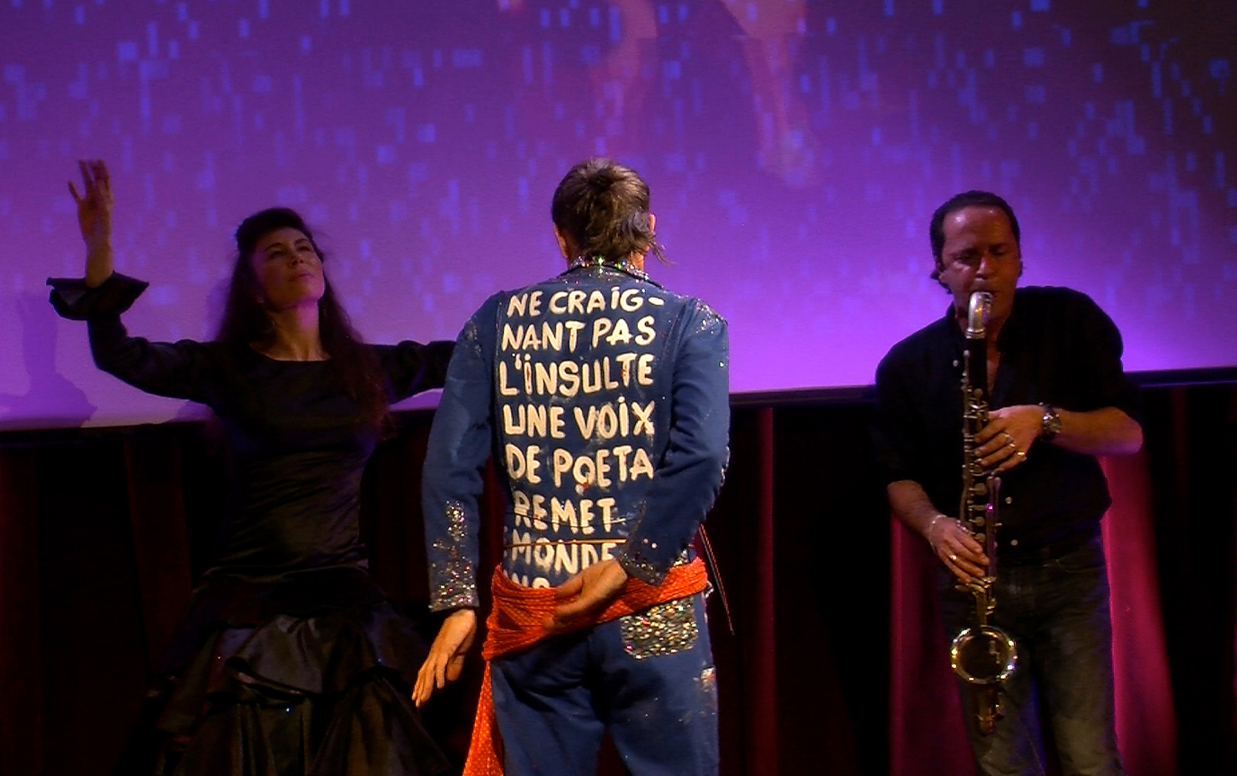 "De la musique avant toute chose", ainsi tentait de définir l’immense poète qu’était Paul Verlaine l’art poétique, et ce beau vers impair pourrait résumer à lui seul le superbe concert auquel nous avons assisté hier soir. Musique et poésie étaient au rendez-vous et n’ont pas failli. Les musiciens, Diego el Kinki aux manettes de son super ordinateur créateur de musique et soutien sans faille du chant inspiré de Juliàn Demoraga, et David Marcos au saxo et à la clarinette basse jouant en contrechant sur la superbe poésie chantée de Juliàn, ont fait passer un souffle emmêlé de rock, de flamenco et de free jazz vers un public enthousiaste, déconstruisant et reconstruisant le flamenco, à la manière des grands peintres du siècle dernier qui faisaient renaître la poésie de leur toile sur les fragments concassés de la figuration. Le groupe s’est produit hier sur la toile de fond d’une création visuelle de Ivan Chabanaud, qui lui aussi, à sa manière, tente de créer à partir de documents anciens (un film sur la mort de Manolete, un encierro) une œuvre personnelle aux accents psychédéliques.