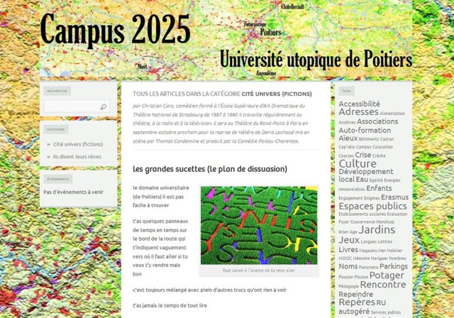 A partir des entretiens avec des acteurs de l’Université de Poitiers et des habitants de la région Poitou-Charentes (synthèses dans la rubrique "Ils disent leurs rêves"), didattica a demandé à Christian Caro d’écrire une fiction littéraire qu’il a nommée "Cité univers"