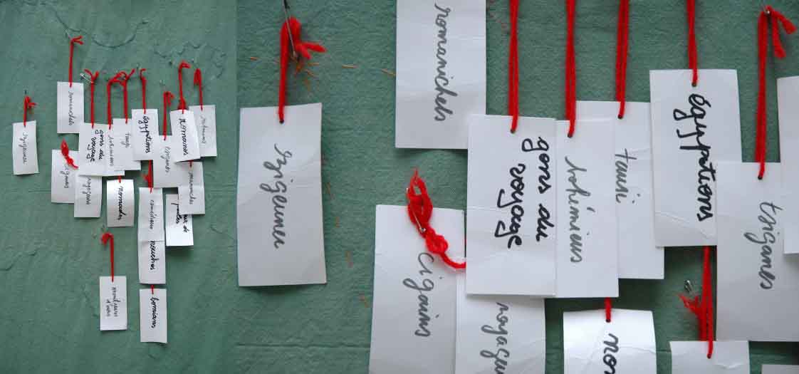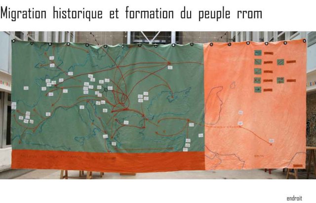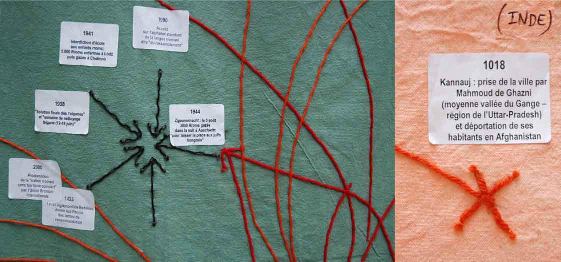 D’un côté, la carte reprend la migration historique du peuple rrom qui va du continent asiatique au continent européen et présente une chronologie de l’histoire des Rroms avec les évènements principaux. De l’autre, les coutures de la carte servent de support aux noms-étiquettes souvent donnés aux Rroms dans les différents pays.