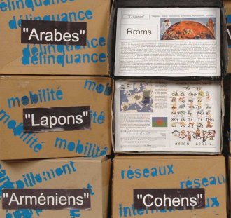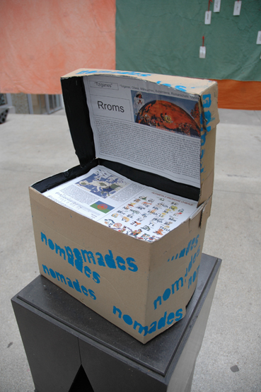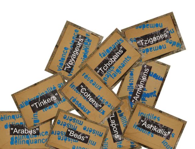 A l’extérieur, des noms-étiquettes et des stéréotypes attribués aux peuples européens sans territoire compact et sans Etat. Ces stéréotypes sont tamponnés sur le dessus de la boîte : les mots sont présentés au pochoir bleu en référence à un graffiti peint « à la va vite » sur un mur.