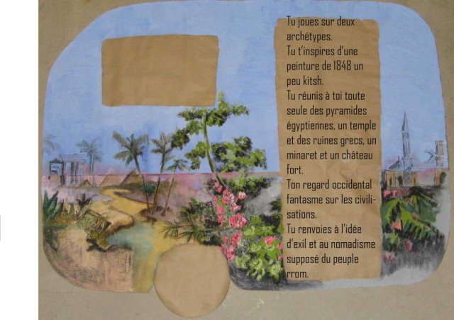 L’image réalisée sur du kraft représente une caravane en grand format. Sur celle-ci, est peint un paysage largement inspiré d’une peinture de 1848 intitulée « Eldorado » et destinée à un carton de tapisserie pour la manufacture Zuber. Ce paysage kitsch condense à lui seul, un ensemble d’archétypes architecturaux : les pyramides égyptiennes, le temple et les ruines grecs, le minaret, un morceau de château fort. Ce type de tapisserie correspond à une vision fantasmée d’un regard occidental sur les civilisations. Il est encore très en vogue dans certains intérieurs bourgeois.