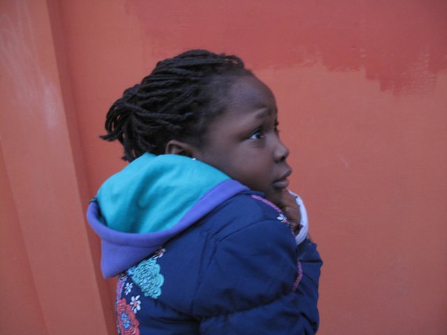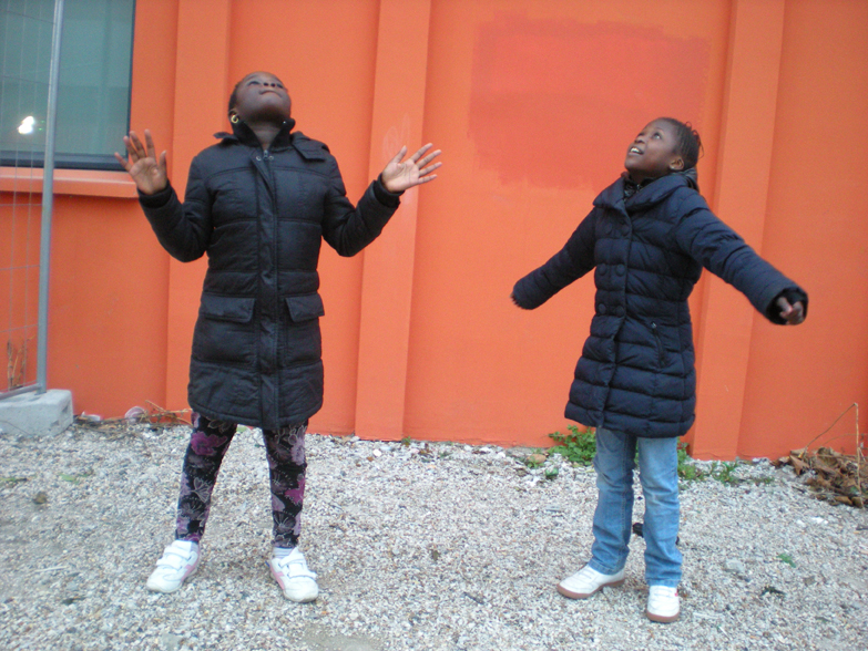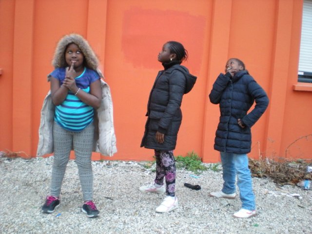 C’est le moment de la pause, les dessins sont finis. Stella présente la suite de la séance : « Maintenant on va prendre des photos d’émotions ». L’équipe sort de la bibliothèque et se dirige devant le mur orange de la PMI afin de prendre en photo des expressions corporelles et des visages pour enrichir le futur montage photos/dessins.