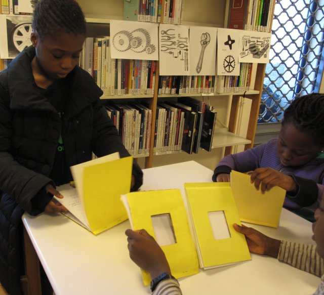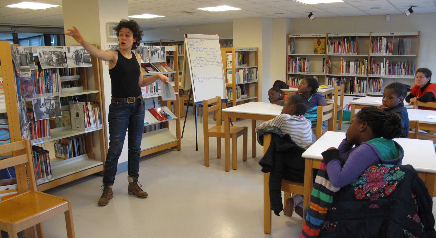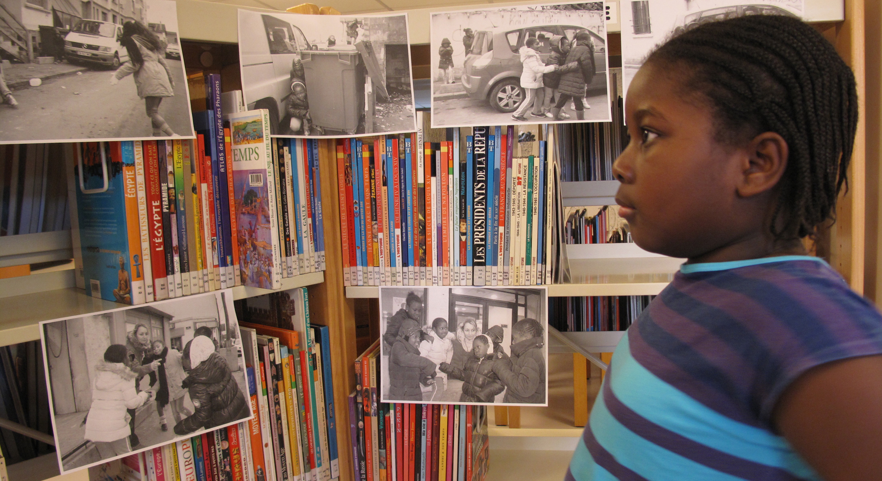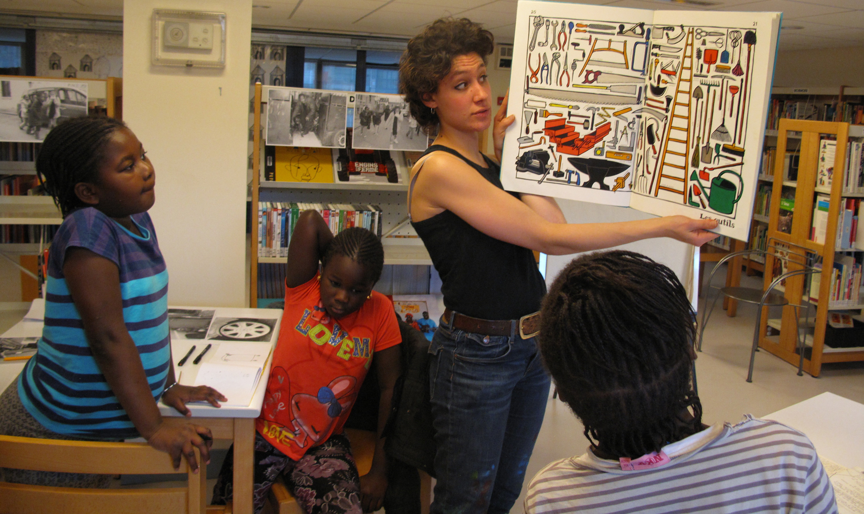 Les photographies de mises en scène dans le quartier, prises la semaine dernière par les filles, sont accrochées sur les étagères de la bibliothèque. Elles sont accompagnées d’iconographies représentant des outils.