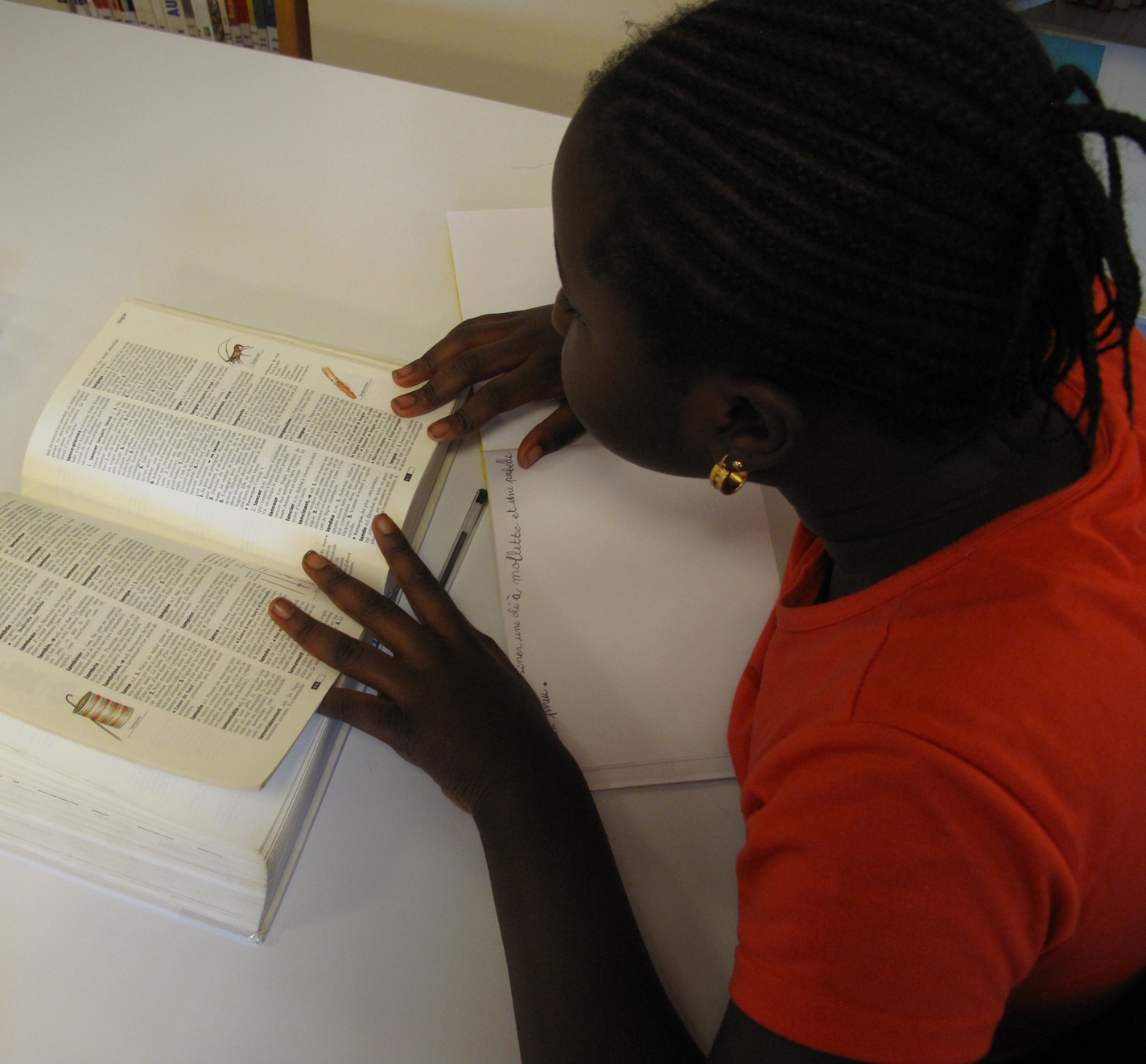 Pour commencer, il s’agit d’abord d’énumérer les éléments qui constituent le décor et d’écrire la liste sur le carnet. Les filles écrivent doucement en s’aidant du dictionnaire. Sétou demande à sa voisine Diaba qui est plus à l’aise avec l’orthographe. Stella et Horia les aident également.