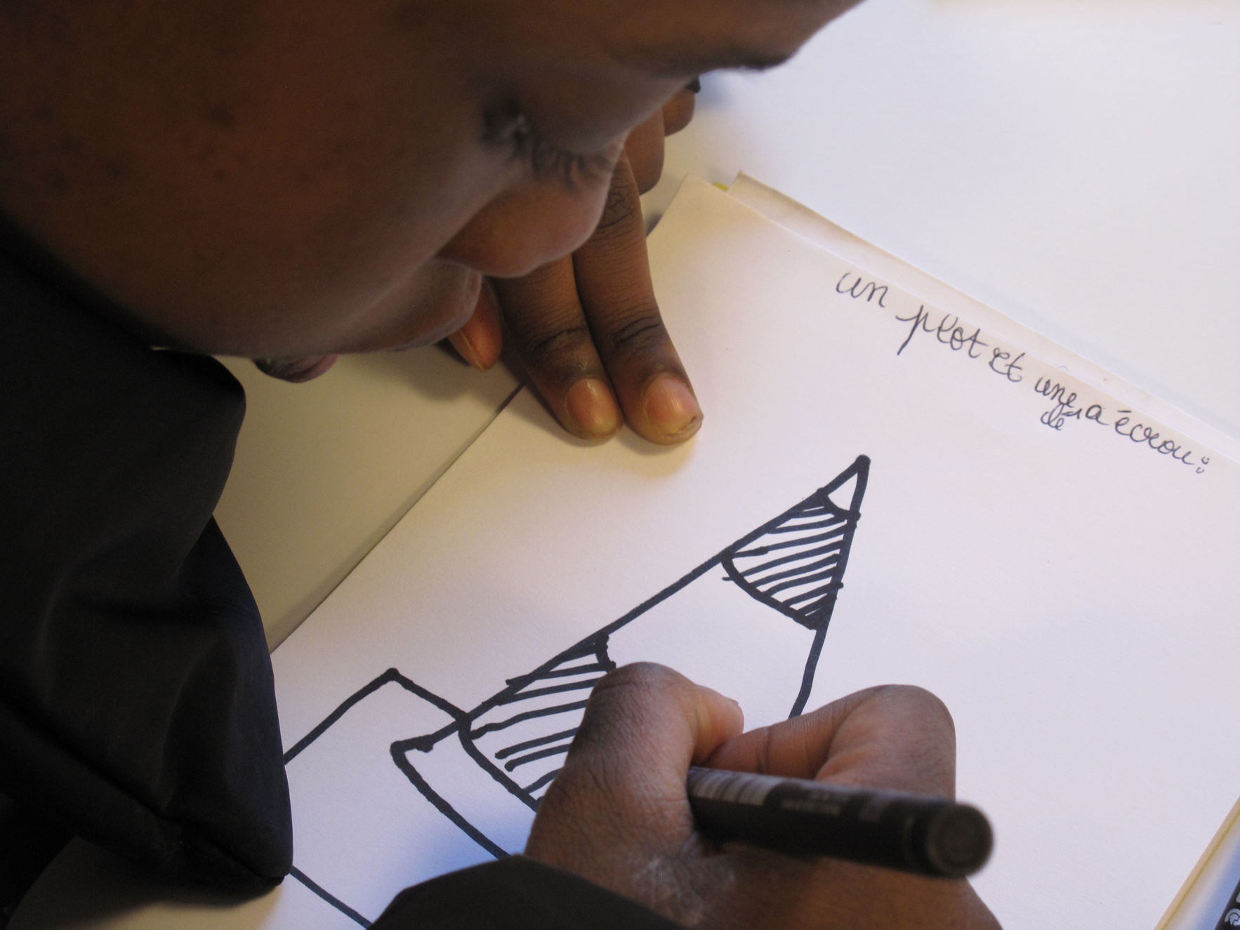 Un rapide tour de table détermine ensuite qui dessine quoi. Aïcha représentera un escalier, Hawa une clef à molette, une poubelle, un pneu, Sétou une clef à écrous et Diaba un plot de chantier.