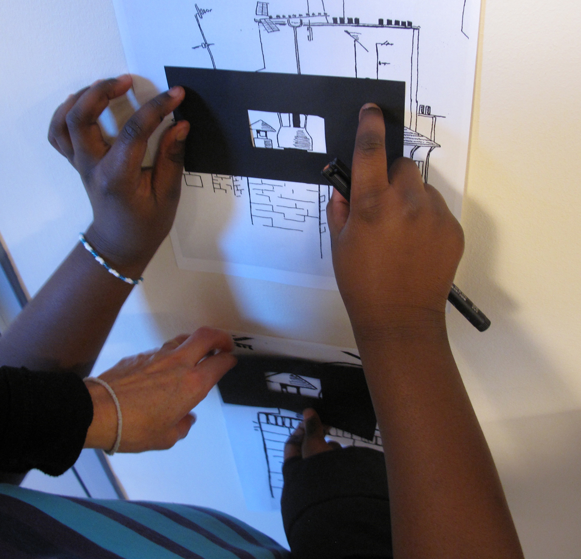 Les cadres en papier noir, déjà utilisés lors d’une séance passée, sont repris pour faire le choix des détails.
