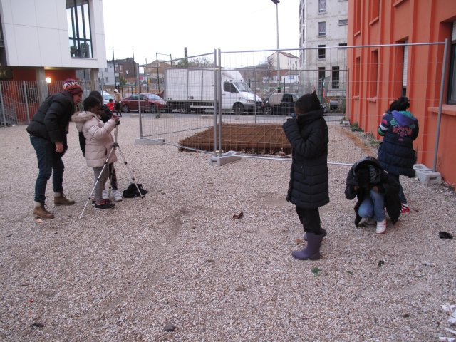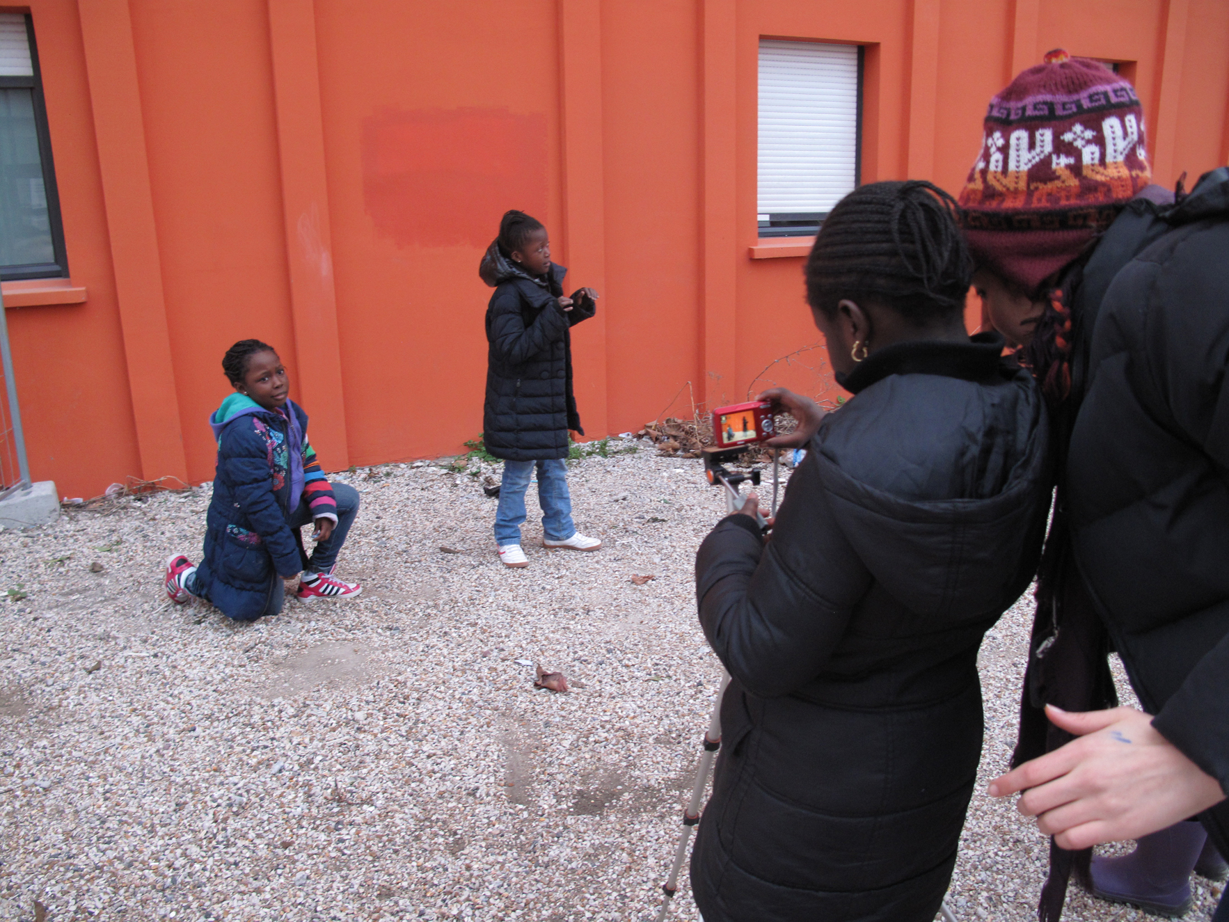 Pour la première scène, celle du cache-cache, Aïcha et Hawa photographient leurs camarades Sétou, Diaba et Sephora qui prennent la pose.