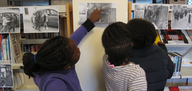 Les filles regardent les photos affichées.