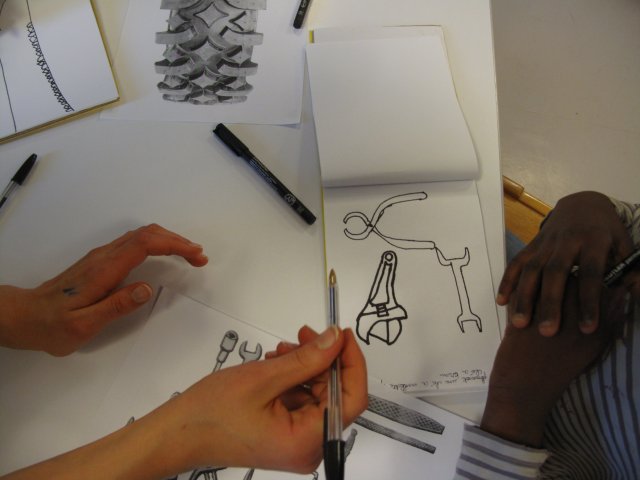Les filles ne s’arrêtent plus, ce n’est plus un seul outil mais toute une série qu’elles reproduisent consciencieusement sur leur carnet. Elles découvrent leur capacité à représenter précisément les objets ou détail du décor et semblent y prendre beaucoup de plaisir.