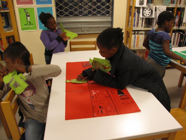 De retour à la bibliothèque, il s’agit maintenant de commencer le montage visuel de leur histoire. Stella demande aux filles de coller les personnages sur les décors qu’elles ont dessinés lors de la séance d’atelier précédente. La composition visuelle prend forme !