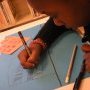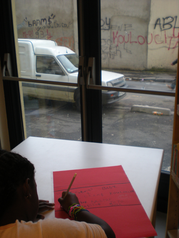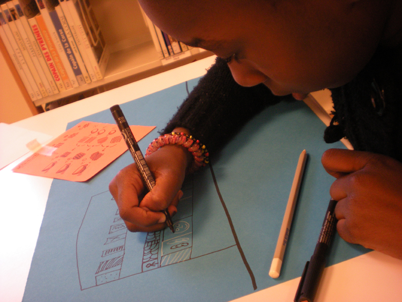 Sephora observe par la fenêtre le mur tagué afin de le dessiner avec beaucoup d’application et à l’identique. Dessiner les décors de leur histoire, c’est quelque chose de très concret pour les filles, il s’agit de leur quartier. Lors de l’exercice de la semaine précédente, elles ont pu prendre du recul sur leur quartier, prendre conscience de l’espace grâce à la maquette et aux mises en scène.