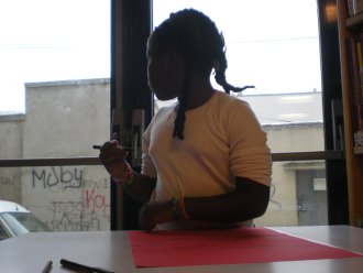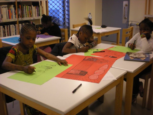 Avant de partir, les filles se regroupent pour exprimer chacune à leur tour leur ressenti de la séance. Sephora commence : « J’ai aimé quand on a fait les dessins et j’ai oublié le reste. Ah non ! J’ai bien aimé regarder les livres. ». Diaba est très enthousiaste : « J’ai tout aimé ! » Aïcha, « Moi, j’ai aimé quand on a dessiné mais pas quand on a regardé les livres, je n’ai pas aimé celui-ci ». Elle pointe le livre de P. Cox. Sétou enchaîne : « Moi je n’ai pas aimé celui-ci », visant du doigt un livre de Hockney. Stella leur répond : « Quand je vous ai montré les images, c’est pour que vous puissiez regarder les différentes techniques de dessin. ».