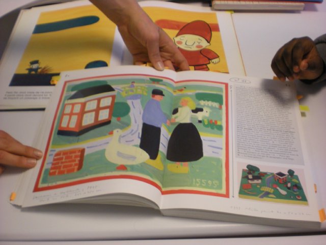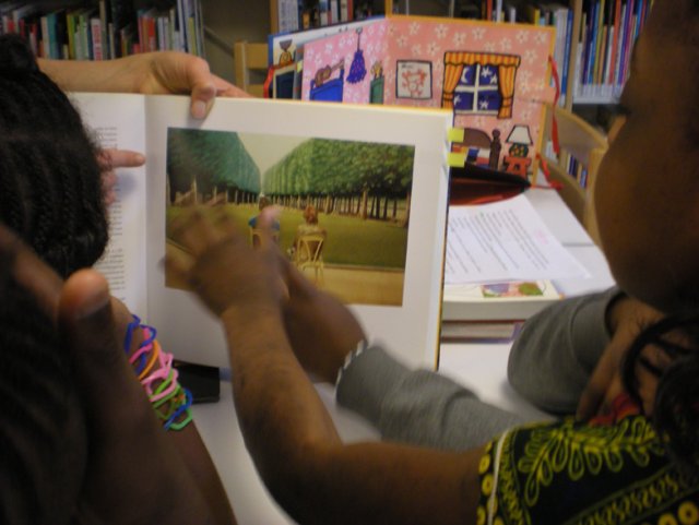 Stella relit l’histoire. Des sourires se dessinent, elles se souviennent. Stella continue : « Ce sont ces trois moments que l’on va illustrer. Est ce que vous savez ce que c’est qu’un décor ? ». Silence. Stella montre des images de livres d’art et album pour enfants afin d’expliquer ce nouveau terme.