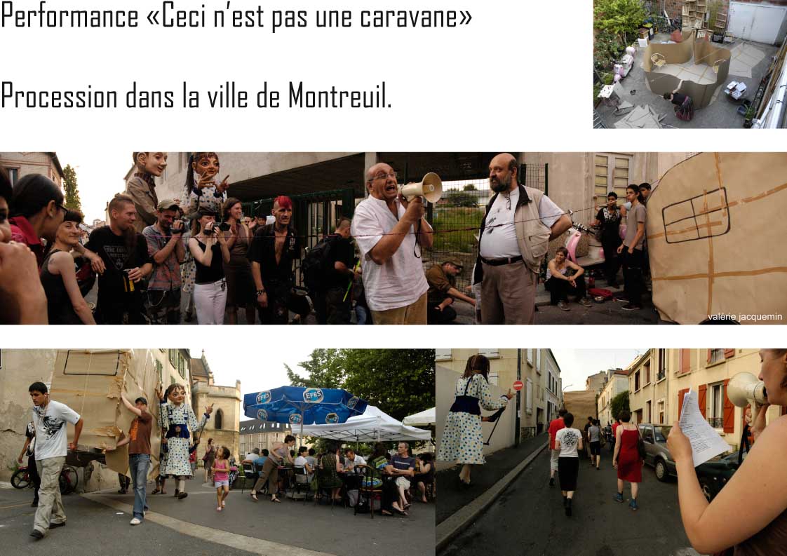 Les photos de la performance réalisée par Valérie Jacquemin retracent le processus de destruction d’une représentation de caravane. De sa construction à sa destruction en passant par la procession dans les rues de Montreuil, les photographies seront présentées de manière linéaire sans rupture dans l’espace d’exposition. En effet, les images seront comme une frise chronologique qui se déploiera sur les trois principaux espaces de la salle.