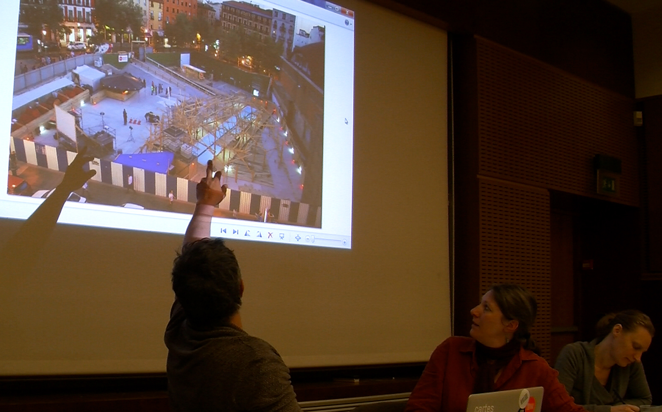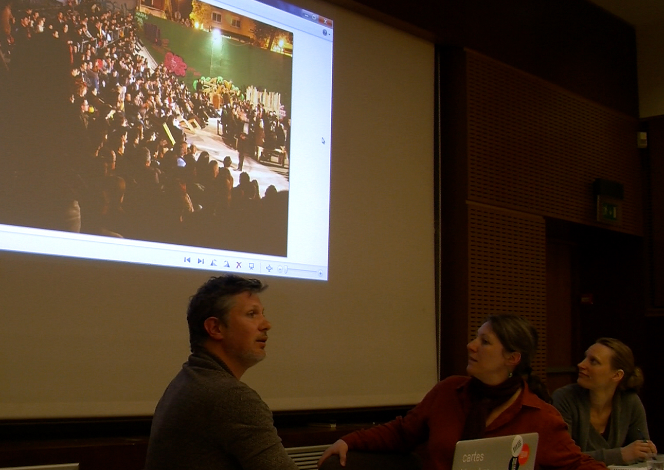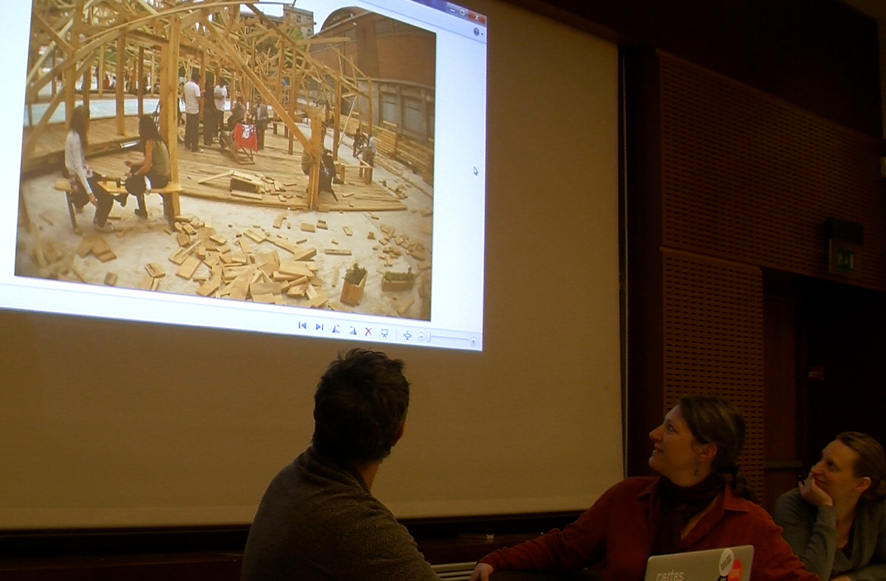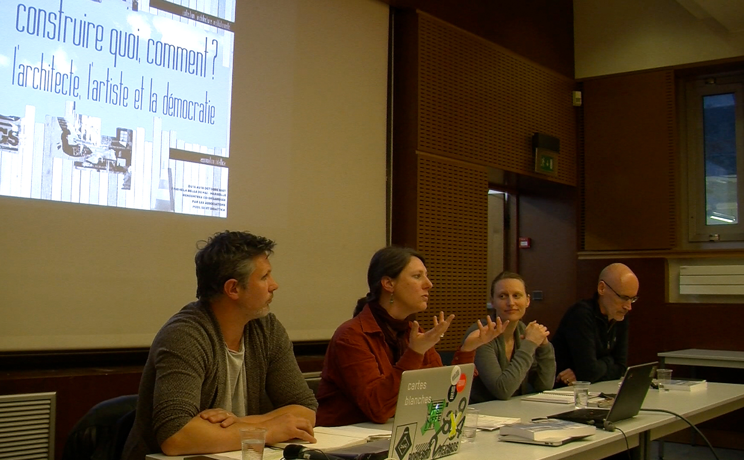 Elise Macaire nous a parlé de l’actualité politique des collectifs d’architectes, artistes, chercheurs présents dans l’ouvrage, en les resituant dans une histoire qui remonte à la fin des années 90, et depuis 2007 (référence à sa thèse de doctorat dont les Rencontres de 2007 étaient l’un de ses terrains de recherche « L’architecture à l’épreuve de nouvelles pratiques. Recompositions professionnelles et démocratisation culturelle »).