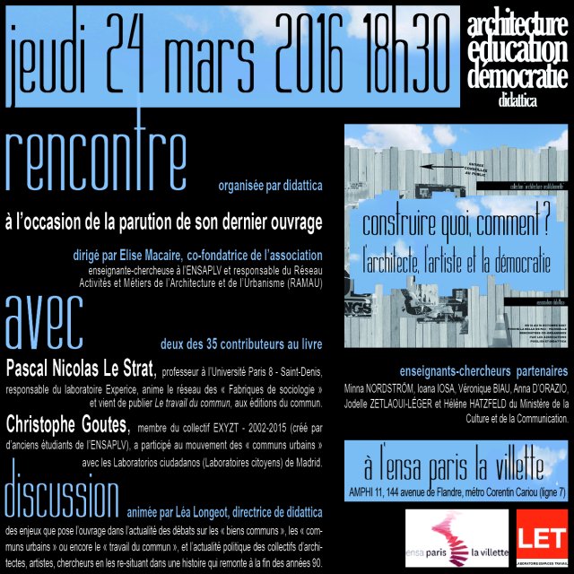 Discussion sur les enjeux que pose l’ouvrage dans l’actualité des débats sur les "biens communs", les "communs urbains" ou encore le "travail du commun", et l’actualité politique des collectifs d’architectes, artistes, chercheurs en les re-situant dans une histoire qui remonte à la fin des années 90.