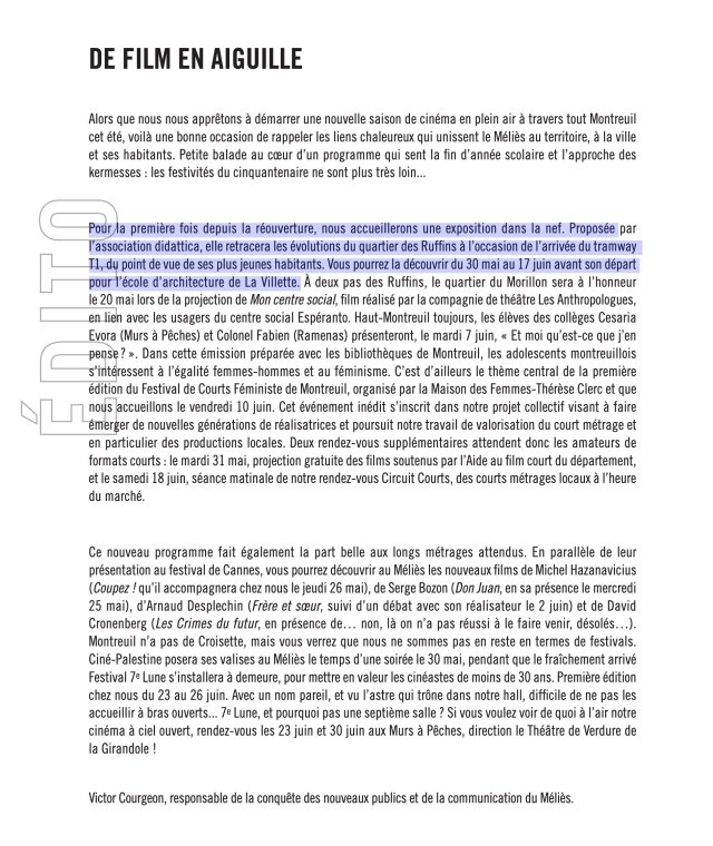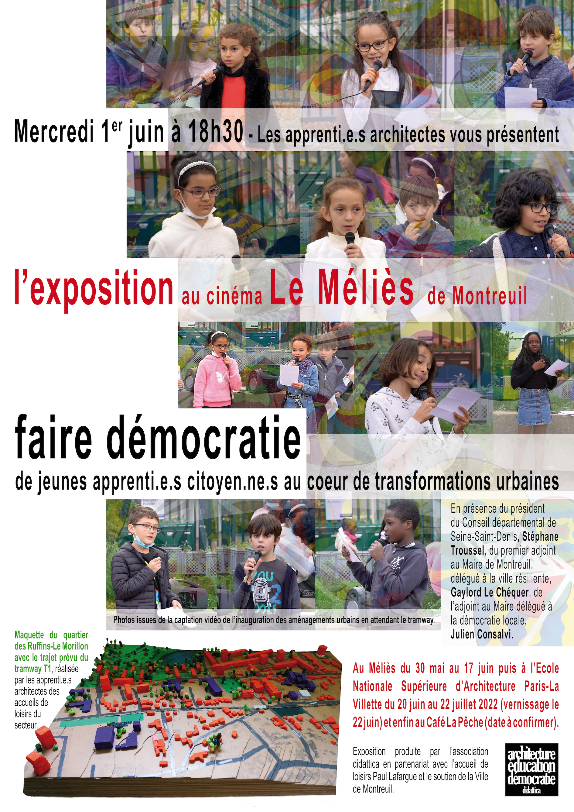 A compter du 30 mai 2022, se tient au cinéma Le Méliès de Montreuil, une exposition co-réalisée avec des enfants et adolescents afin de présenter une démarche pédagogique et citoyenne autour de la conception et la réalisation architecturale et urbaine d’aménagements transitoires préfigurant l’arrivée du prolongement du tramway T1 dans le quartier Ruffins- Le Morillon de la Ville de Montreuil.