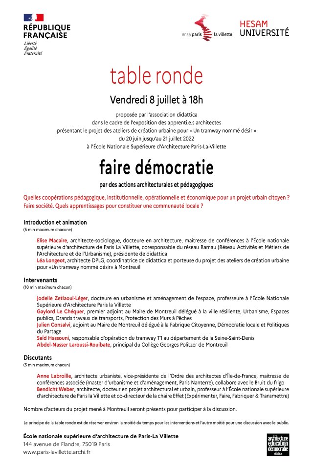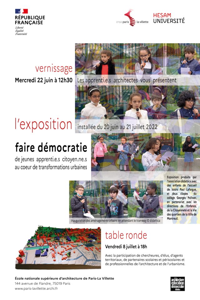 Une table ronde se déroule au sein de l’exposition, le vendredi 8 juillet 2022 à 18h, avec la participation de chercheures, d’élus, d’agents territoriaux, de partenaires scolaires et périscolaires et de professionnelles de l’architecture et de l’urbanisme.