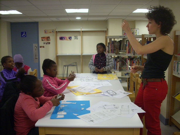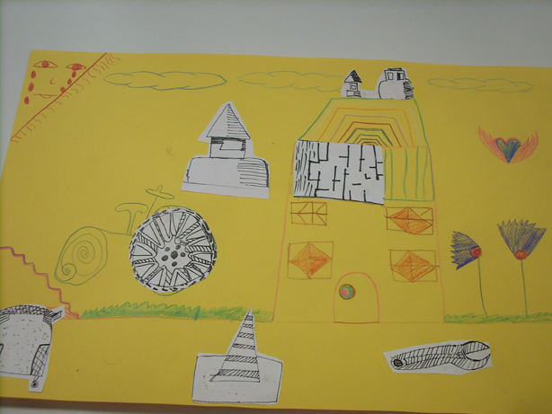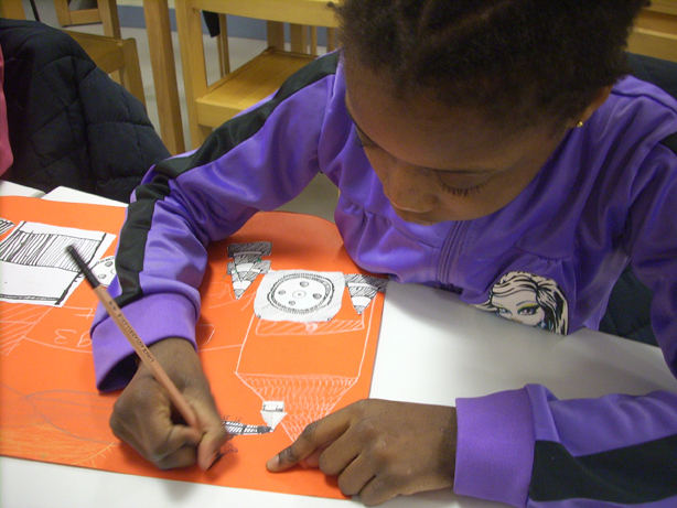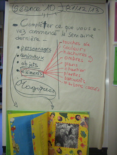Chacune reprend son dessin pendant que Stella donne les consignes : « Vous allez utiliser d’autres matériaux pour composer vos scènes. Par exemple, vous pouvez vous aider des images des yeux représentant des émotions, que vous avez accrochées au mur, rajouter des photos, des dessins… ».