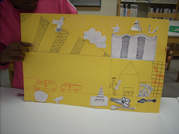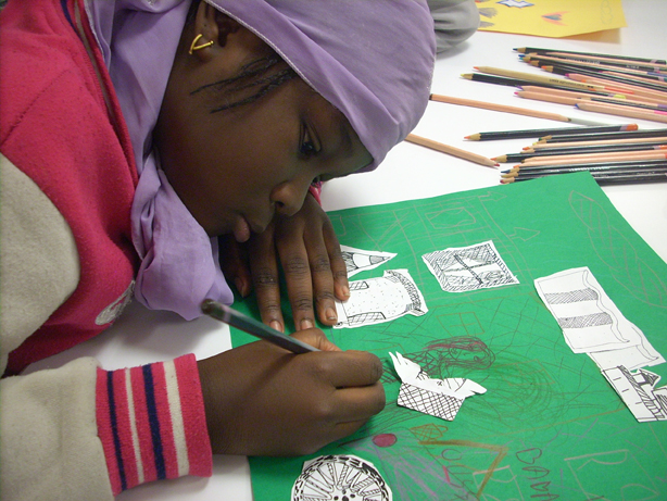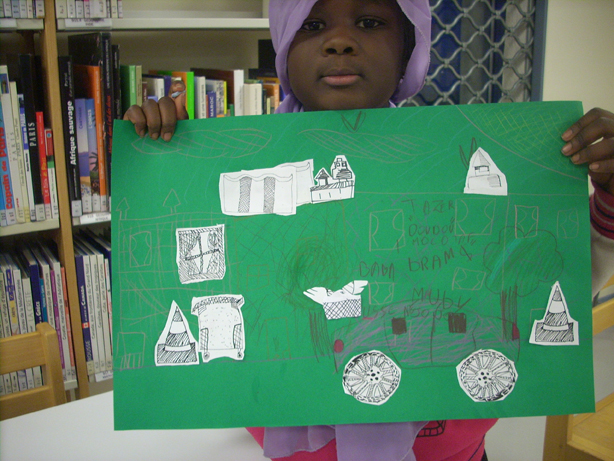 Les filles se lancent, comme toujours, très appliquées. Elles dessinent, découpent, posent, superposent… Leurs choix et compositions permettent de peaufiner la représentation de leur quartier. C’est un sujet autour duquel elles semblent prendre plaisir à échanger et travailler.