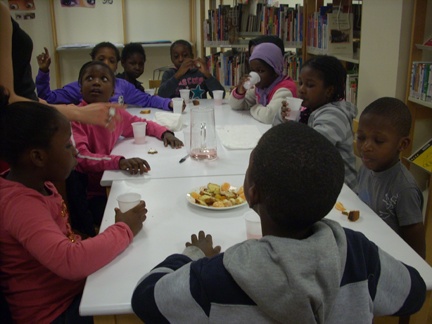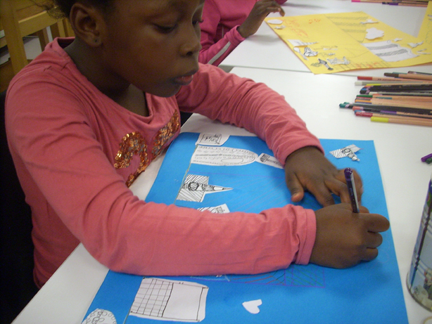 Après la pause rituelle, Stella demande aux filles de positionner les éléments découpés à l’aide de la pâte à fixe.