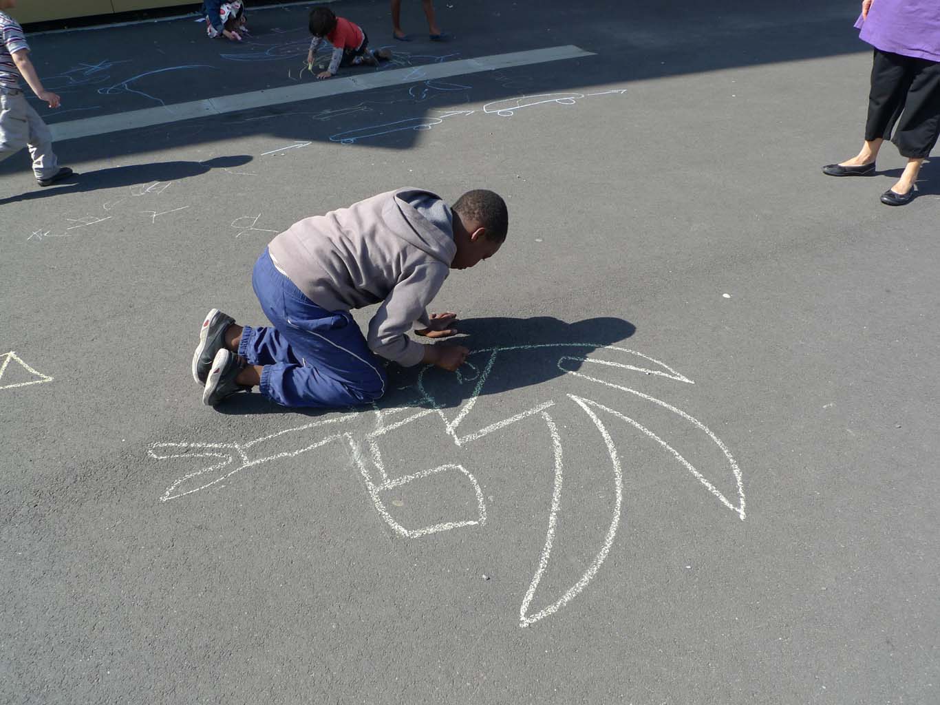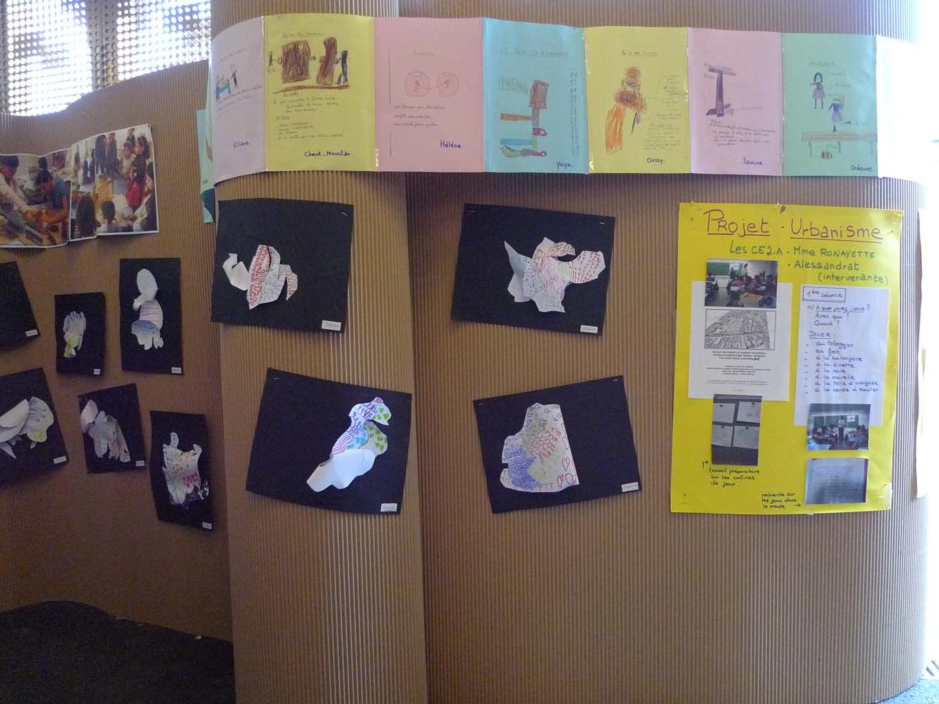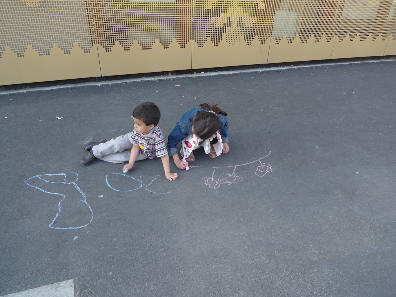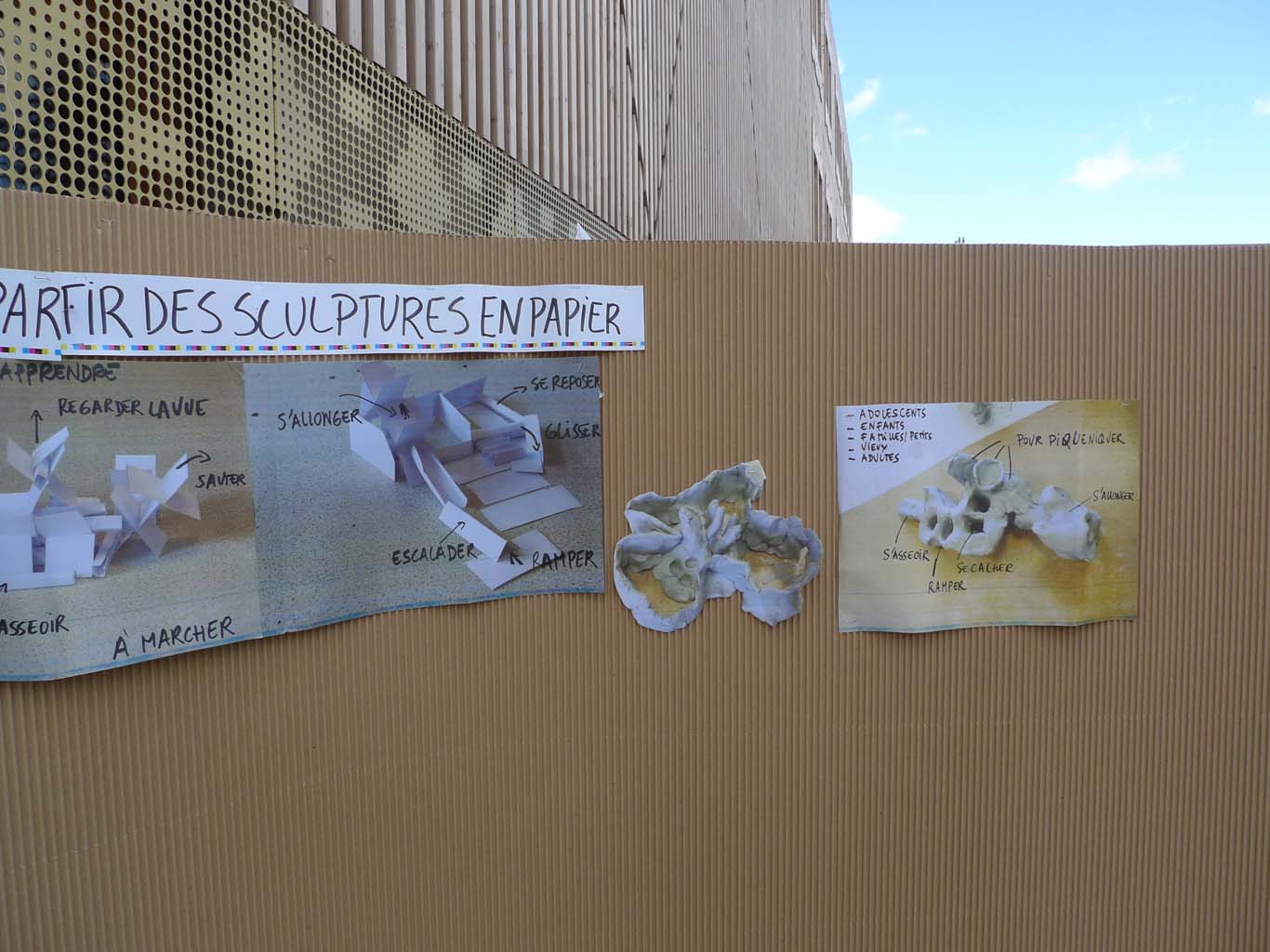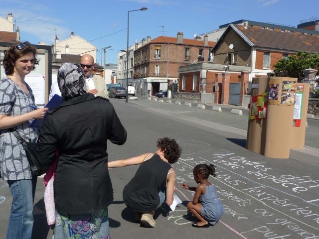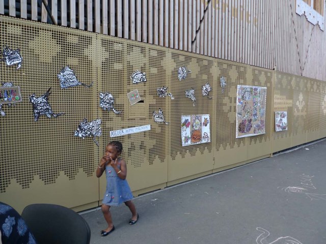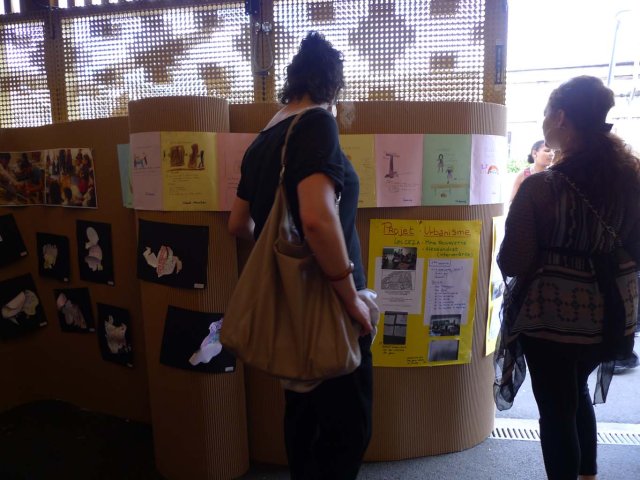 Le projet est entré, ce samedi 30 juin, dans sa deuxième phase. Le parvis de l’école s’est transformé, l’espace de quelques heures, en un petit théâtre de la concertation urbaine. Des grands rouleaux de carton ondulé en guise de cimaises, les dessins des enfants, quelques photographies du processus pédagogique de l’année, une ou deux chaises ont permis aux parents d’élèves de faire connaissance avec les acteurs du projet et d’exprimer très librement leurs envies d’espaces publics.