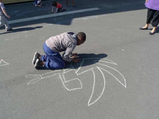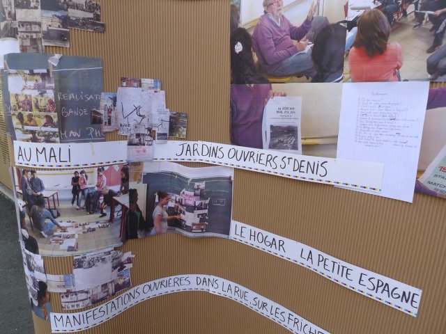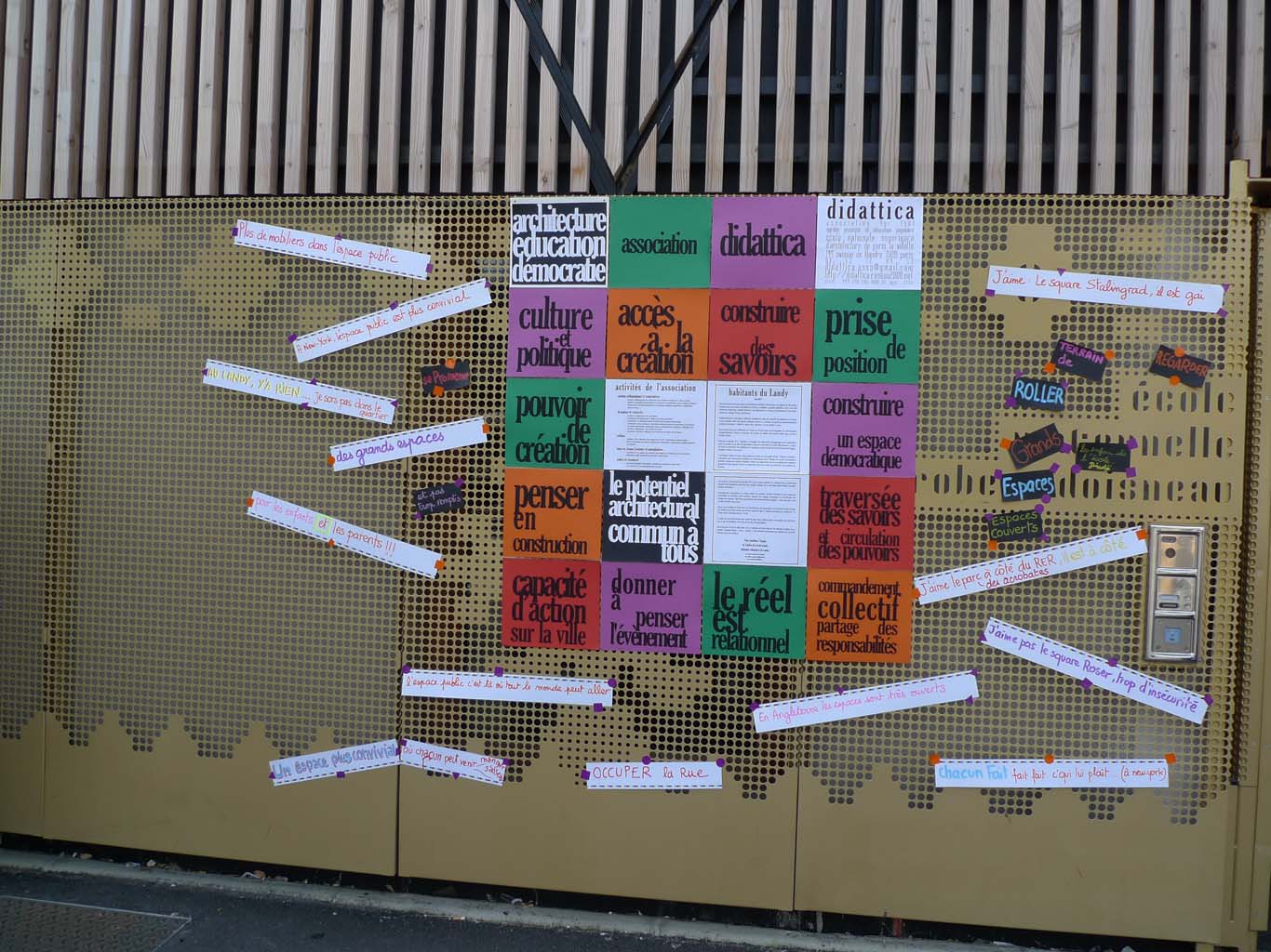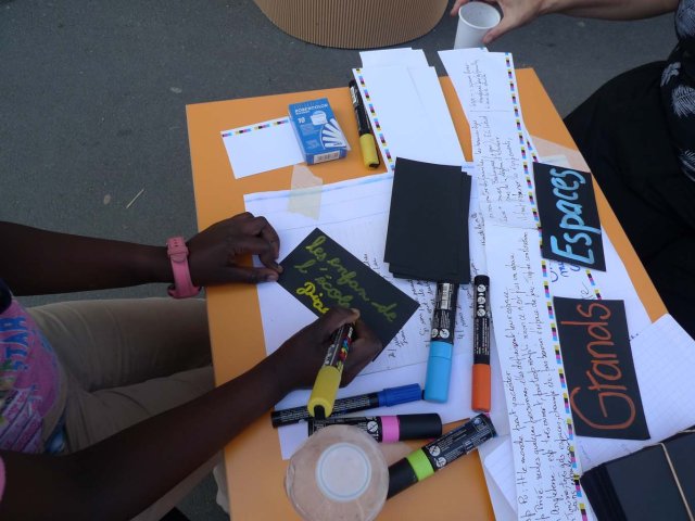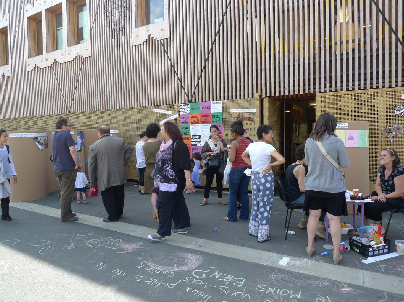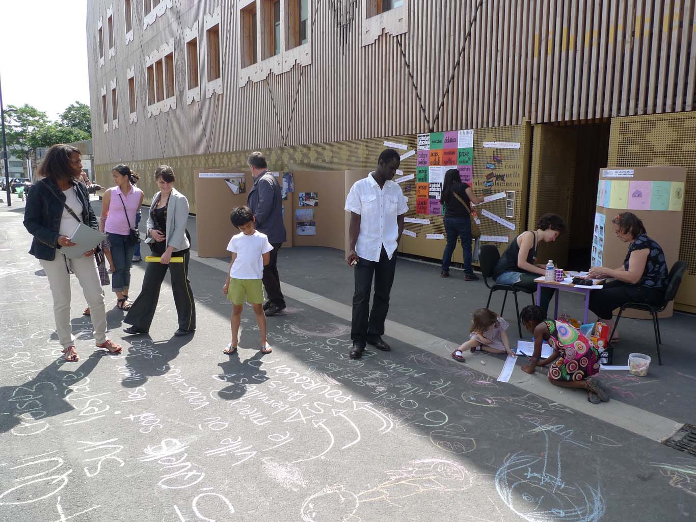 Les habitants, petits et grands, ont été invités à raconter leurs expériences d’espaces publics, de New-York à Aubervilliers. Sylvie Napolitano, assise à la petite table devant l’entrée de l’école, inscrivait sur des petits cartons les envies de chacun, du mobilier de jardin mobile à la création de points de vue sur le quartier, du terrain de roller à la mise à disposition d’espaces couverts. Ces mots ont été accrochés à la grille de l’école, comme autant de directions de travail possible pour le futur Atelier de création urbaine, aux côtés des reproductions des études en terre et des dessins réalisés par les enfants pendant l’année.