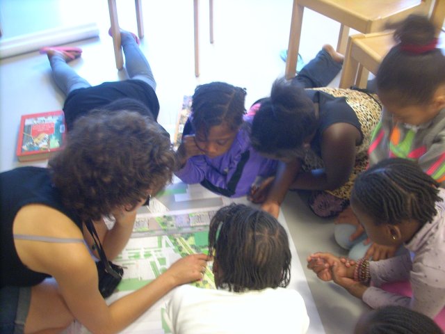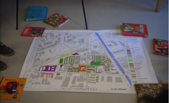 Après les photos, le plan. Les filles y situent différents endroits du quartier avec Stella. Elles cherchent l’école, la médiathèque, le collège Rosa Luxemburg… Stella en profite pour expliquer plusieurs fois des mots de vocabulaire.