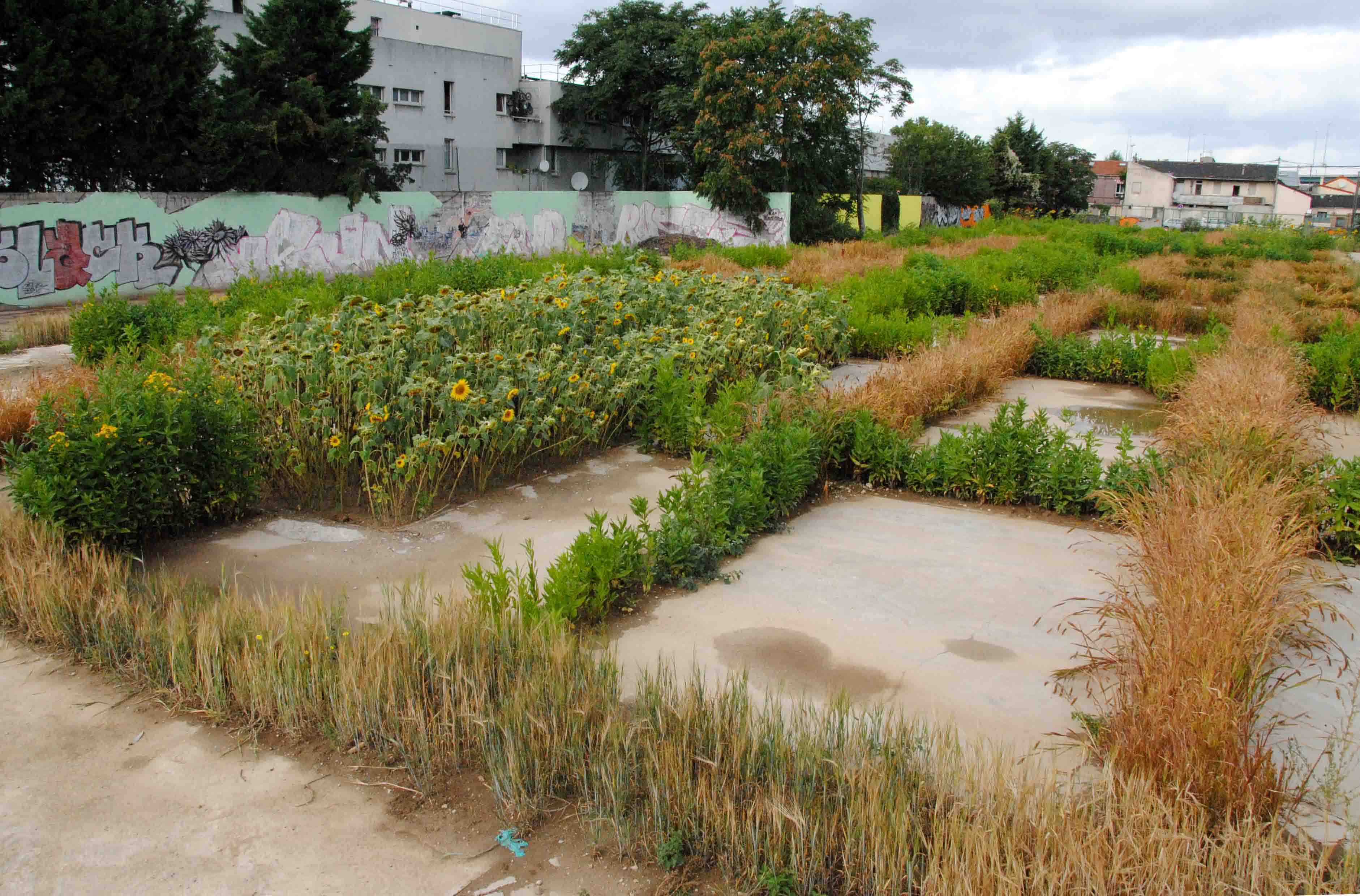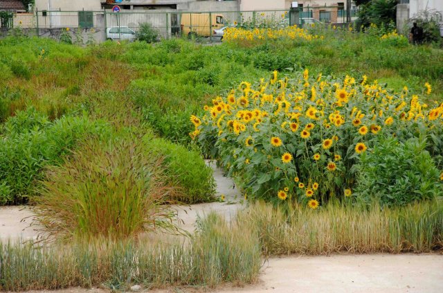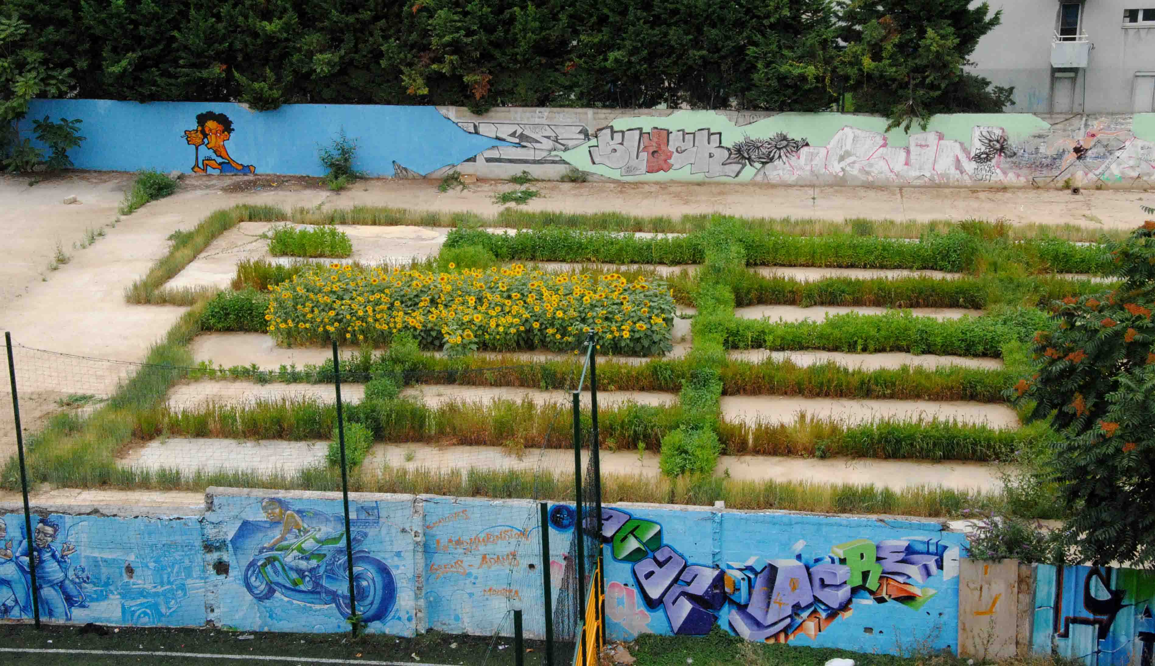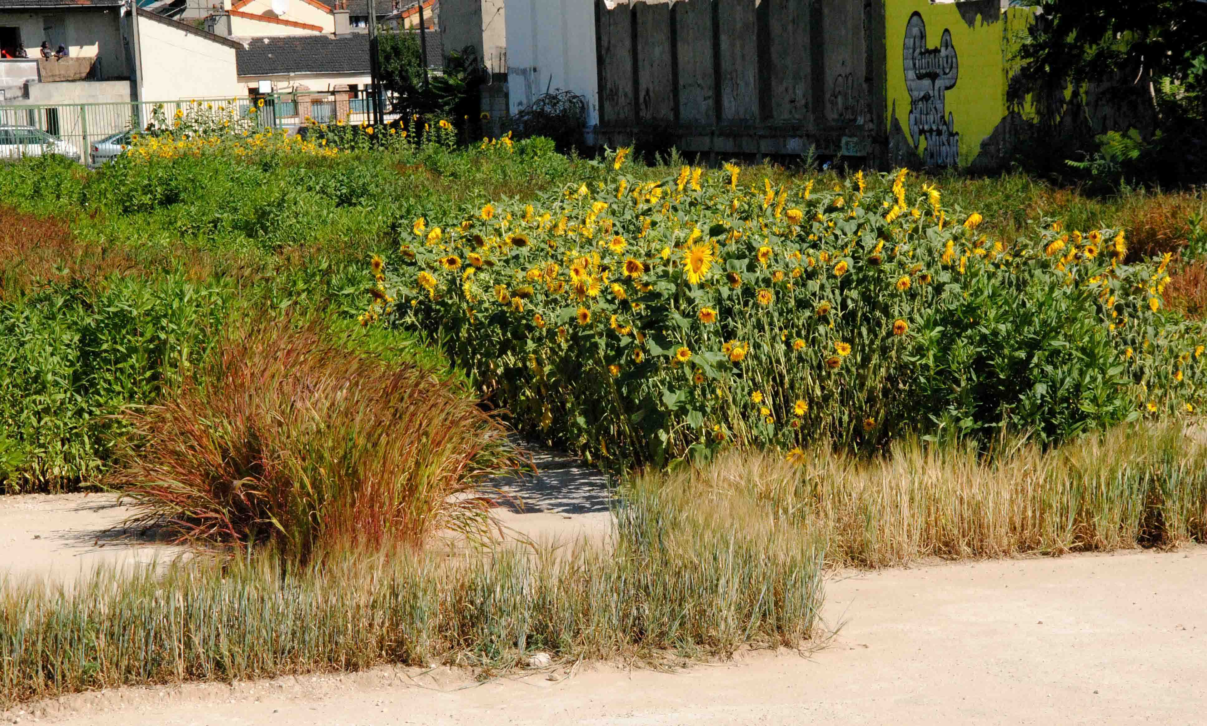 décharge, camions, enfants et tournesols