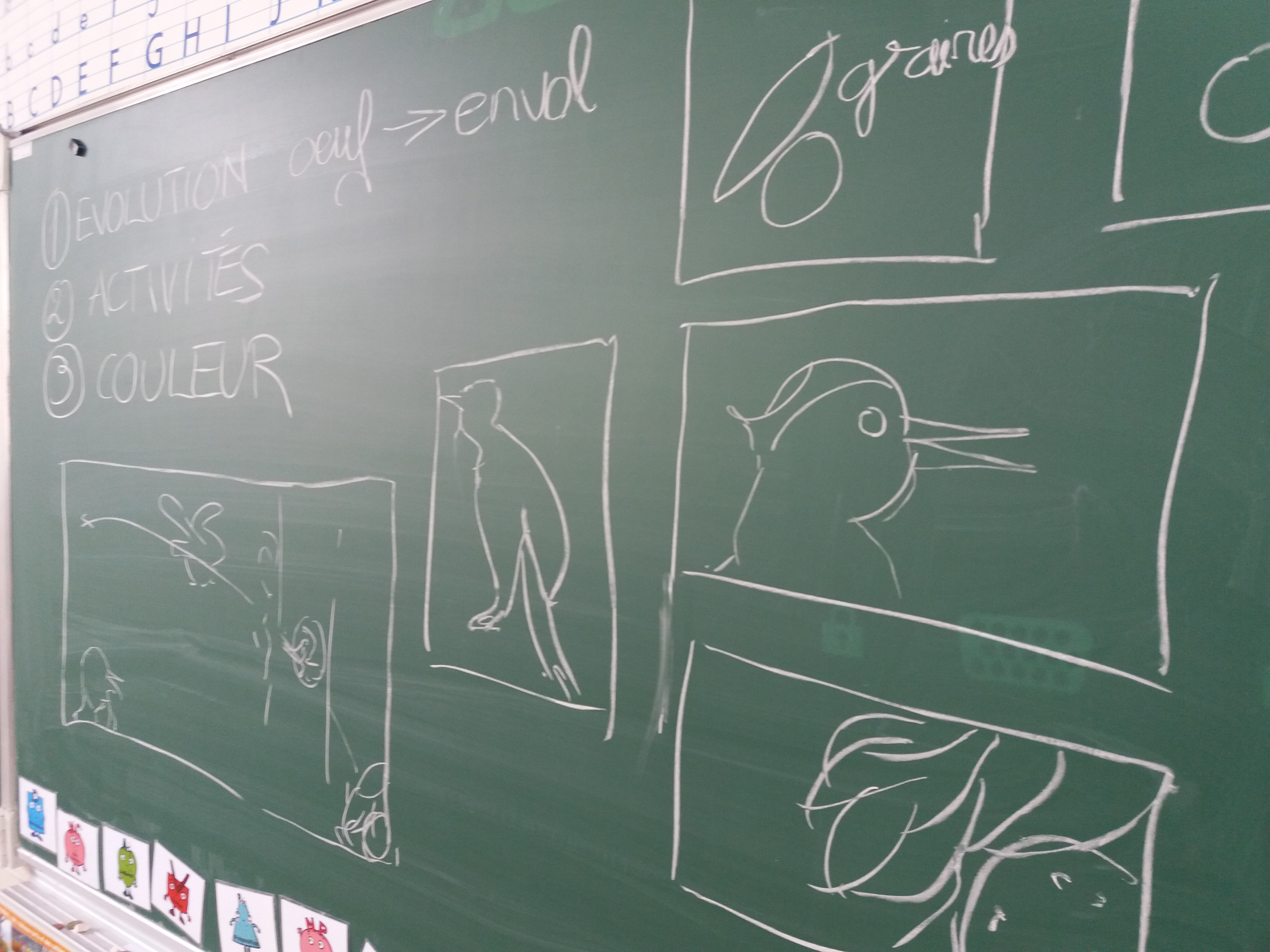 Selon les dessins des différentes catégories, nous avons aidé les enfants à construire une frise qui raconte leur histoire collective de petits piverts à la Petite Boissière, voici le récit coopératif sur le thème de la Solidarité des pivardias et leur attachement à l’Environnement :