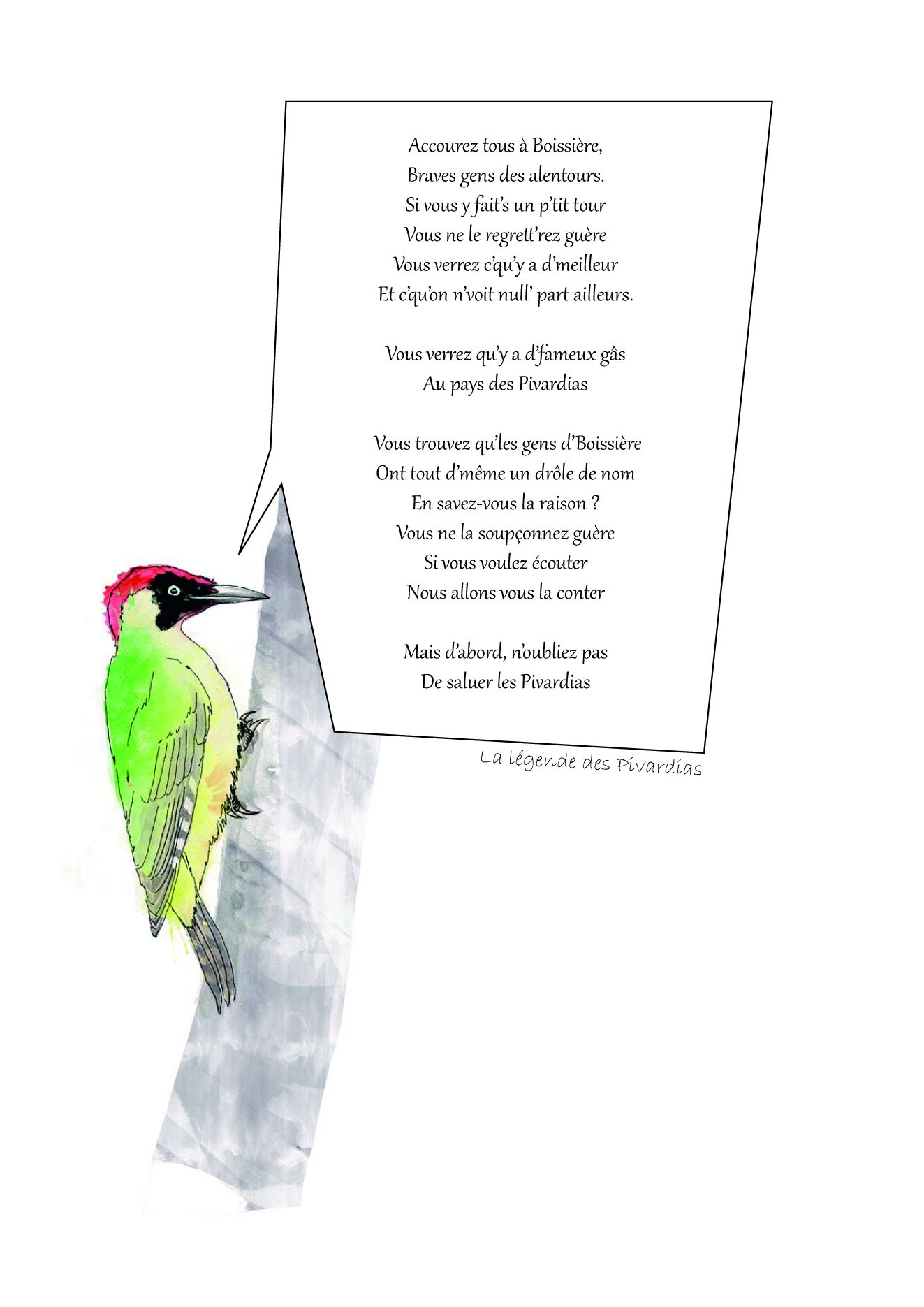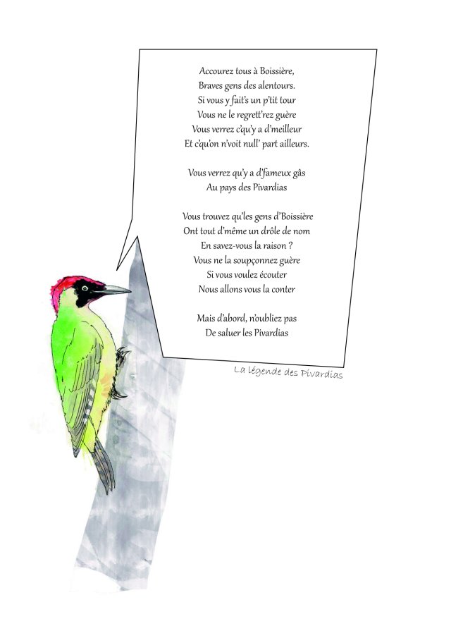 Nous partions de la légende des pivardias et de la chanson, de son interprétation dans le projet d’aménagement et plus particulièrement de la Place-nid. Les habitants de la Petite Boissière s’appellent les pivardias, qui signifient « petits piverts » selon la chanson du même nom.