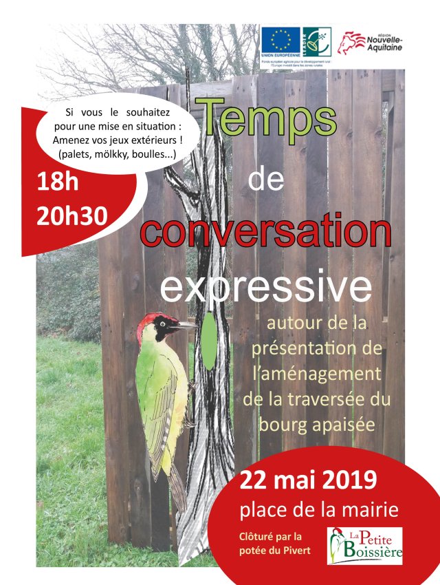 Cet atelier a permis aux élèves de prendre conscience de leur avenir de petits piverts à la Petite Boissière, de prendre soin de leur environnement et de marquer leur présence dans l’espace public, en préliminaire de la soirée du mercredi 22 mai 2019 de "conversation créative".