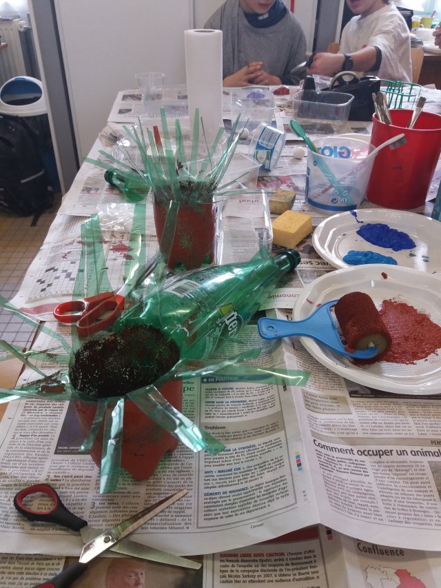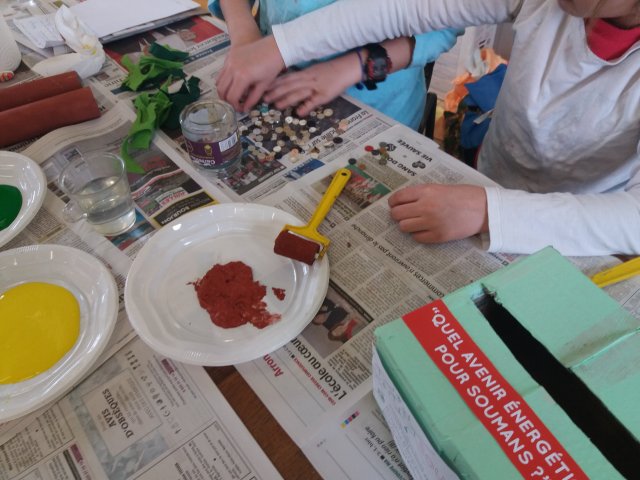Pour rester dans le thème du cycle de vie, et du circuit court, les matériaux mis en œuvre pour ce chantier étaient des matériaux de récupérations (issus de la poubelle « emballage et carton »).