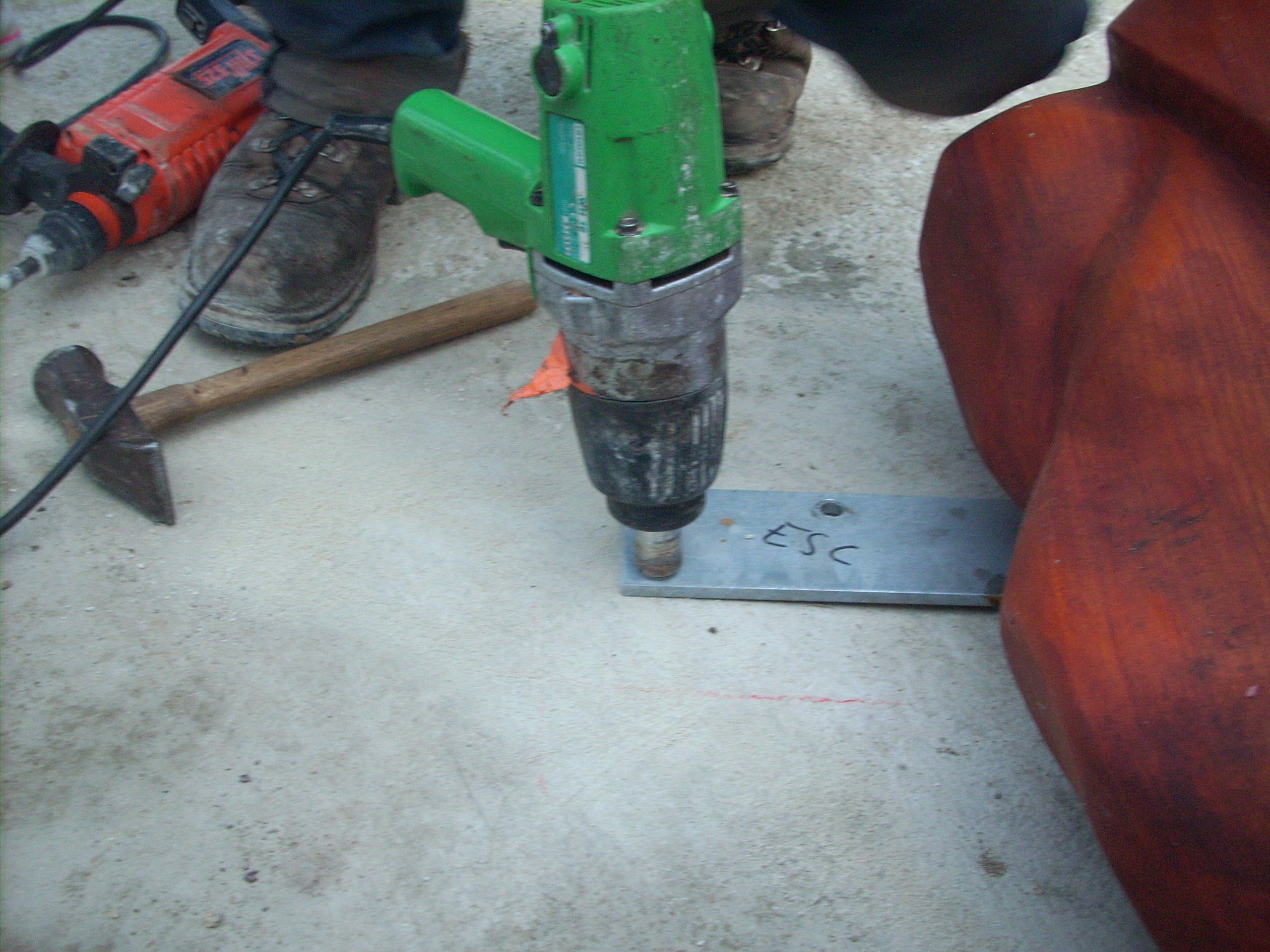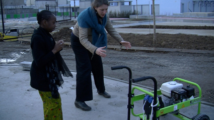 Bidia prend en photo le geste de perforer avec la perforeuse. Jean-Marc explique : « Placer la cheville dans le trou et taper avec le marteau pour l’enfoncer, c’est l’action de spiter. ». Cette opération nécessite de retirer avec la balayette la poussière de béton générée. Alessandrat montre aux filles comment faire pour ensuite les laisser essayer. Les filles sont ravies de participer à l’action.