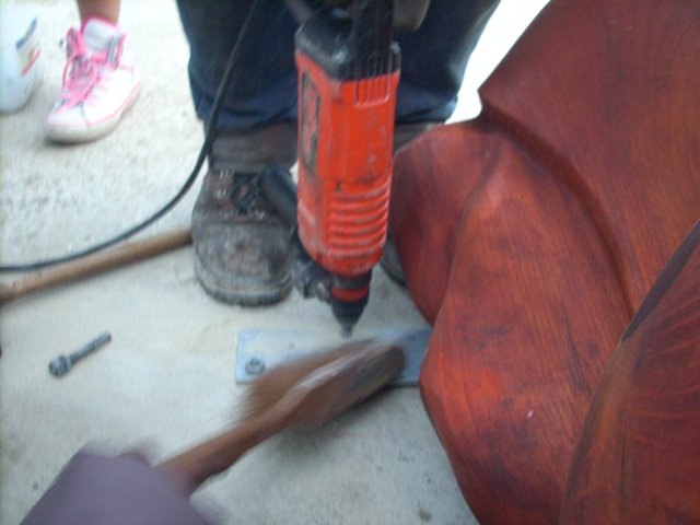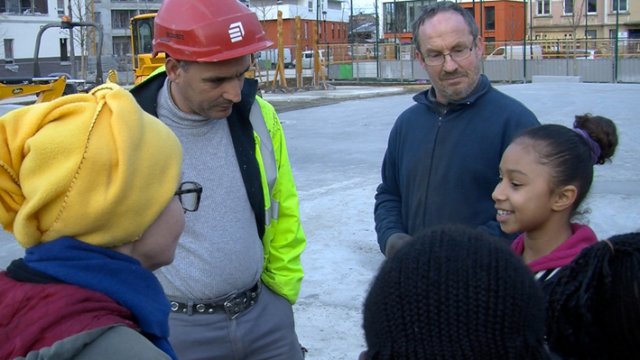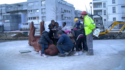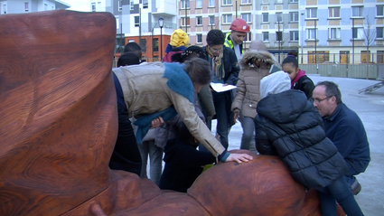 Les filles rencontrent Alessandrat. la sculptrice des jeux du futur square. Elle va leur montrer comment elle fixe les sculptures en bois sur le sol en béton et, leur parler de son métier.