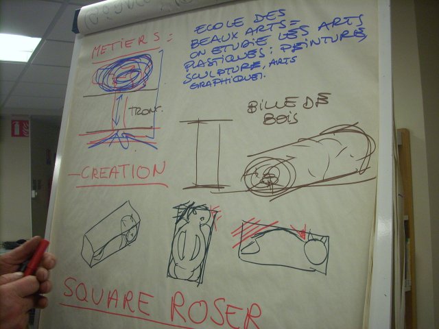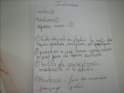 C’était une séance préparatoire à la rencontre de la sculptrice Alessandrat : « Sur quoi vous avez travaillé avec Stella ? ». Hawa répond « Les jeux de bois : les animaux, c’est Alessandrat qui les a fabriqués ».