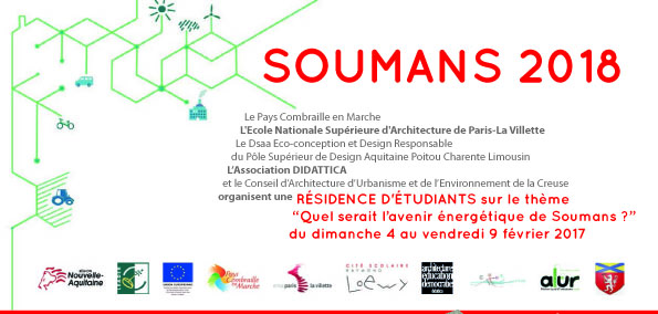 Ce nouveau workshop (rencontre entre habitants, élus et étudiants de l’école nationale supérieure d’architecture de Paris la Villette et du Diplôme Supérieur d’Arts Appliqués de la Cité scolaire Raymond Loewy), organisé sous la forme d’une résidence par didattica et des partenaires locaux (la commune de Soumans, le Pays Combraille en Marche, l’intercommunalité...) aura lieu à Soumans début février 2018 sur le thème :