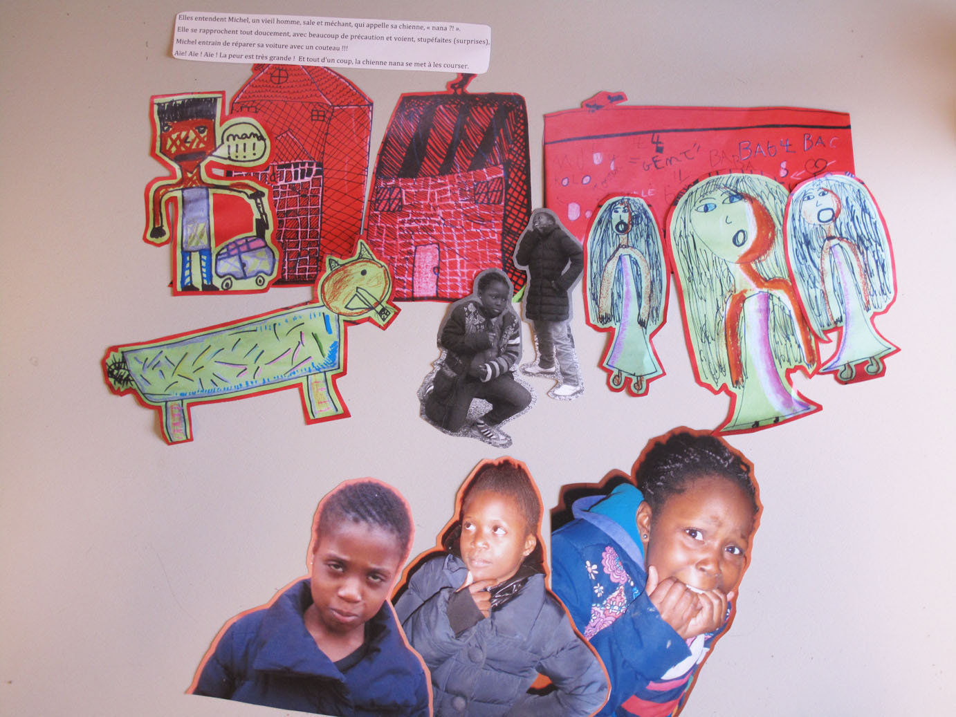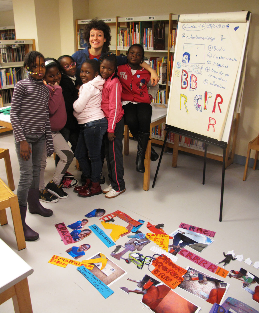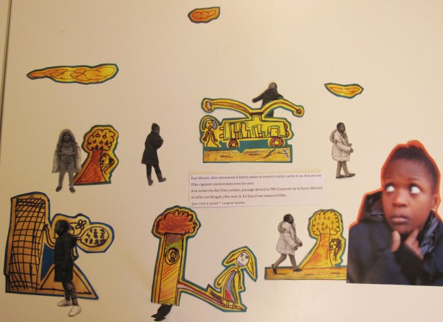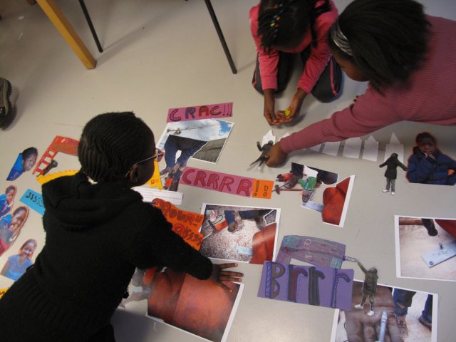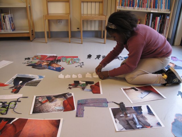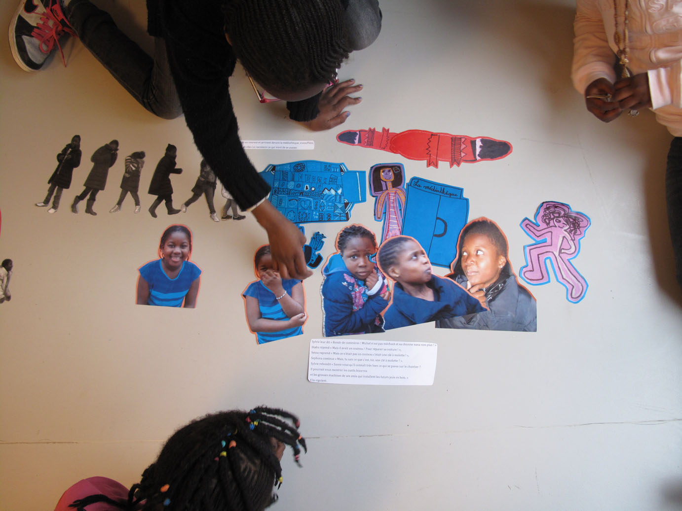 Tout est là, toute la production des 14 dernières séances. A cette quinzième, c’est le début de l’aboutissement de tout le travail : les filles doivent faire un photomontage des quatre scènes de leur histoire en disposant tous les éléments sur le sol. « Il faut que vous fassiez des images collectives », explique Stella. Bidia « ça veut dire qu’on prend toutes les images, on les rassemble et on fait une scène ? ».