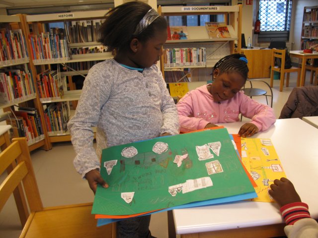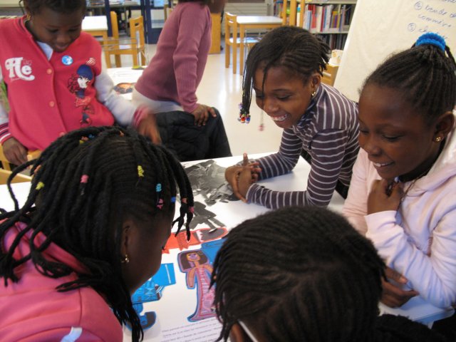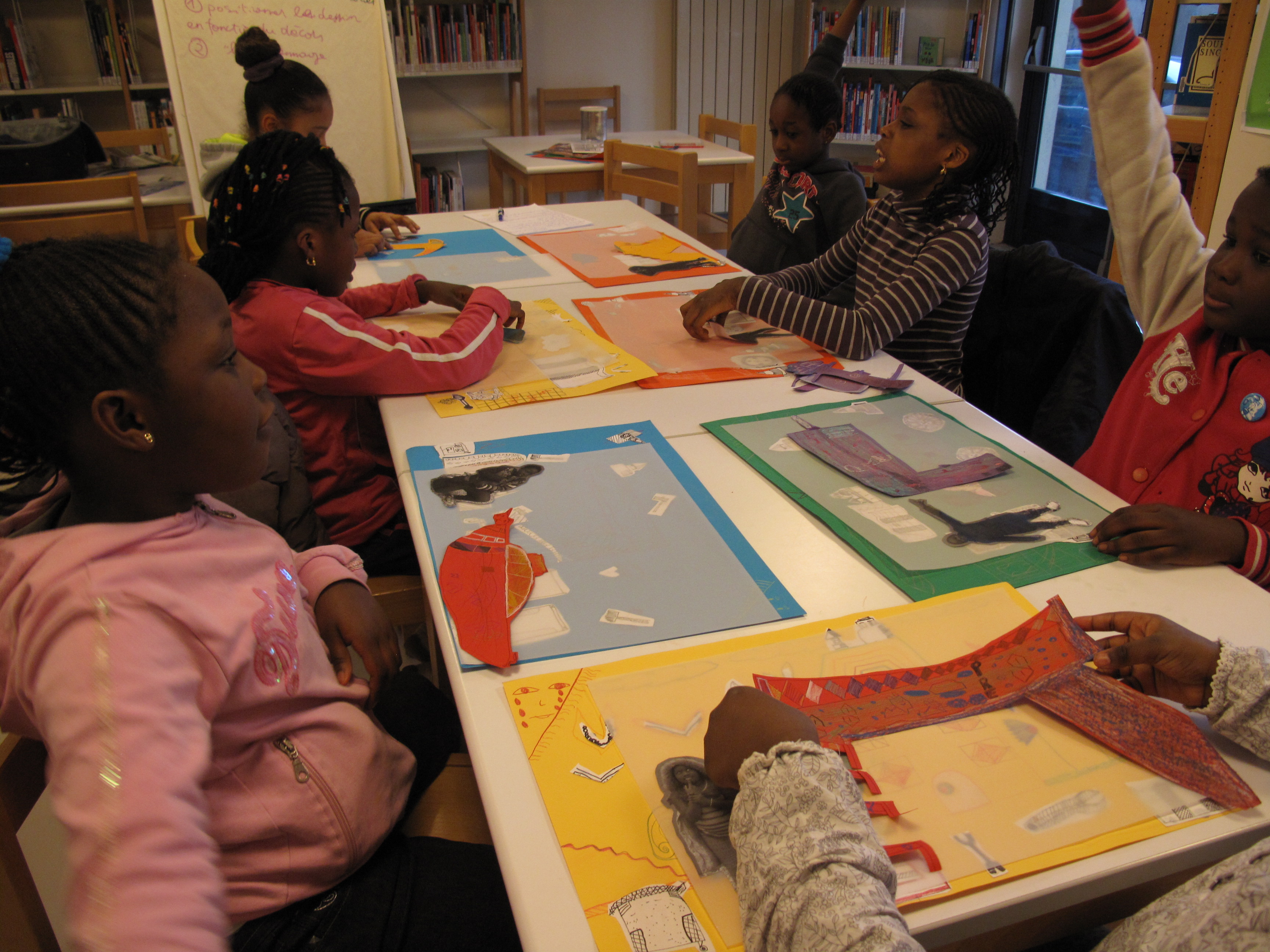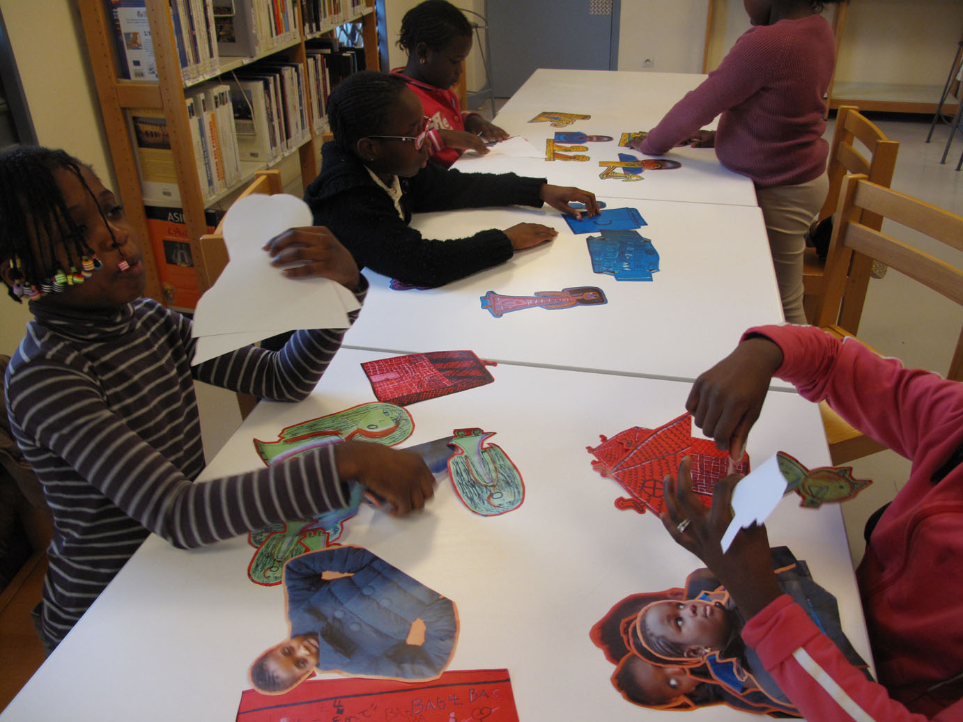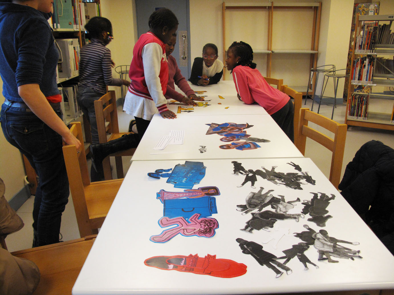 Les images sont toutes là, les filles en choisissent et commencent à trier les éléments par scène. Séphora, Sétou et Diaba s’installent par terre avec les images qu’elles ont choisies, tandis qu’Hawa, Aïcha et Bidia étalent sur la table.