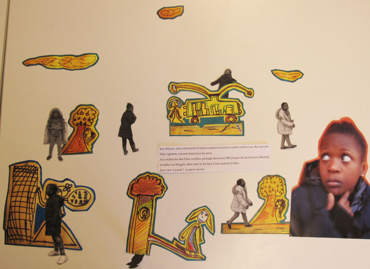 Bidia commence : « on entend vrouuuuu, on entend bambambam… » Les filles continuent en cœur « On entend clocloclo tshiuiuiu, on entend bababa. » Sephora « ça c’est le marteau ». Puis toutes ensemble, elles imitent les bruits du chantier. C’est l’expérience commune qui parle. Le chantier se dessine ainsi pour elles, par ces bruits, qui bercent leur quotidien et sont le signe du changement de leur quartier.