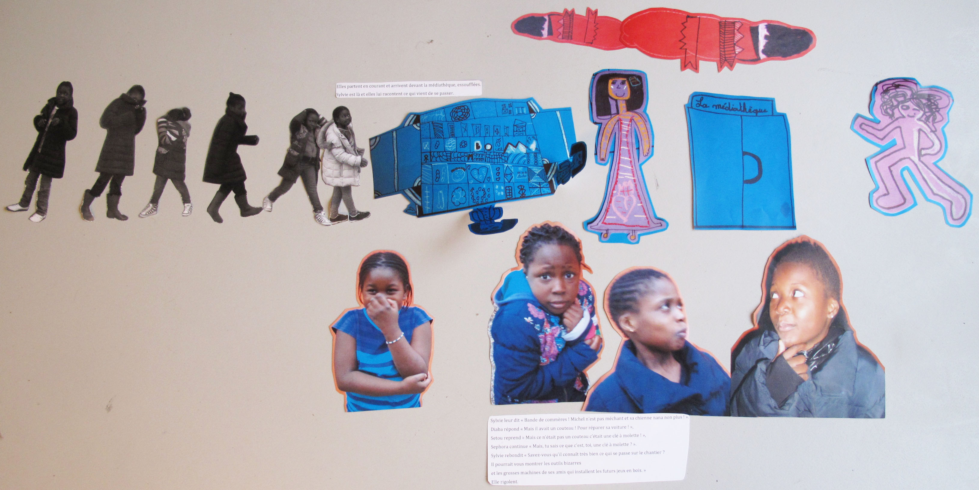On commence par la scène avec Michel. Les filles apportent les éléments et commencent à les positionner au sol pour avoir une vue d’ensemble. Les filles se souviennent très bien des éléments qu’elles ont produits et composent ainsi rapidement les photomontages.