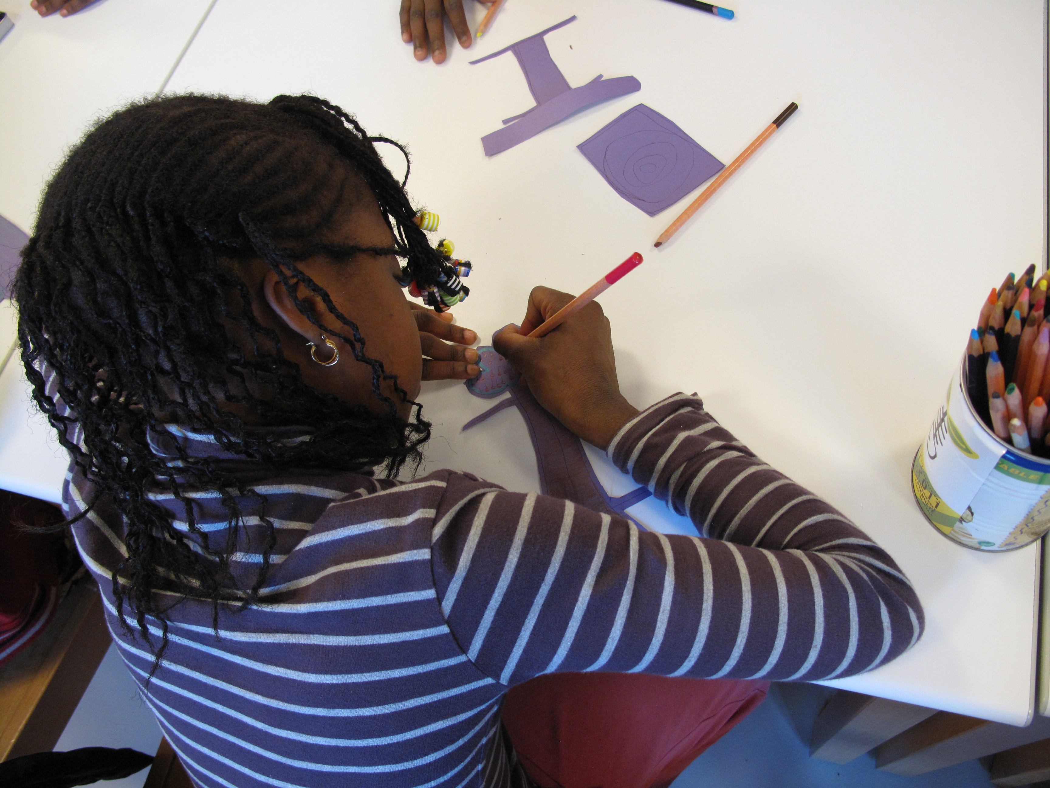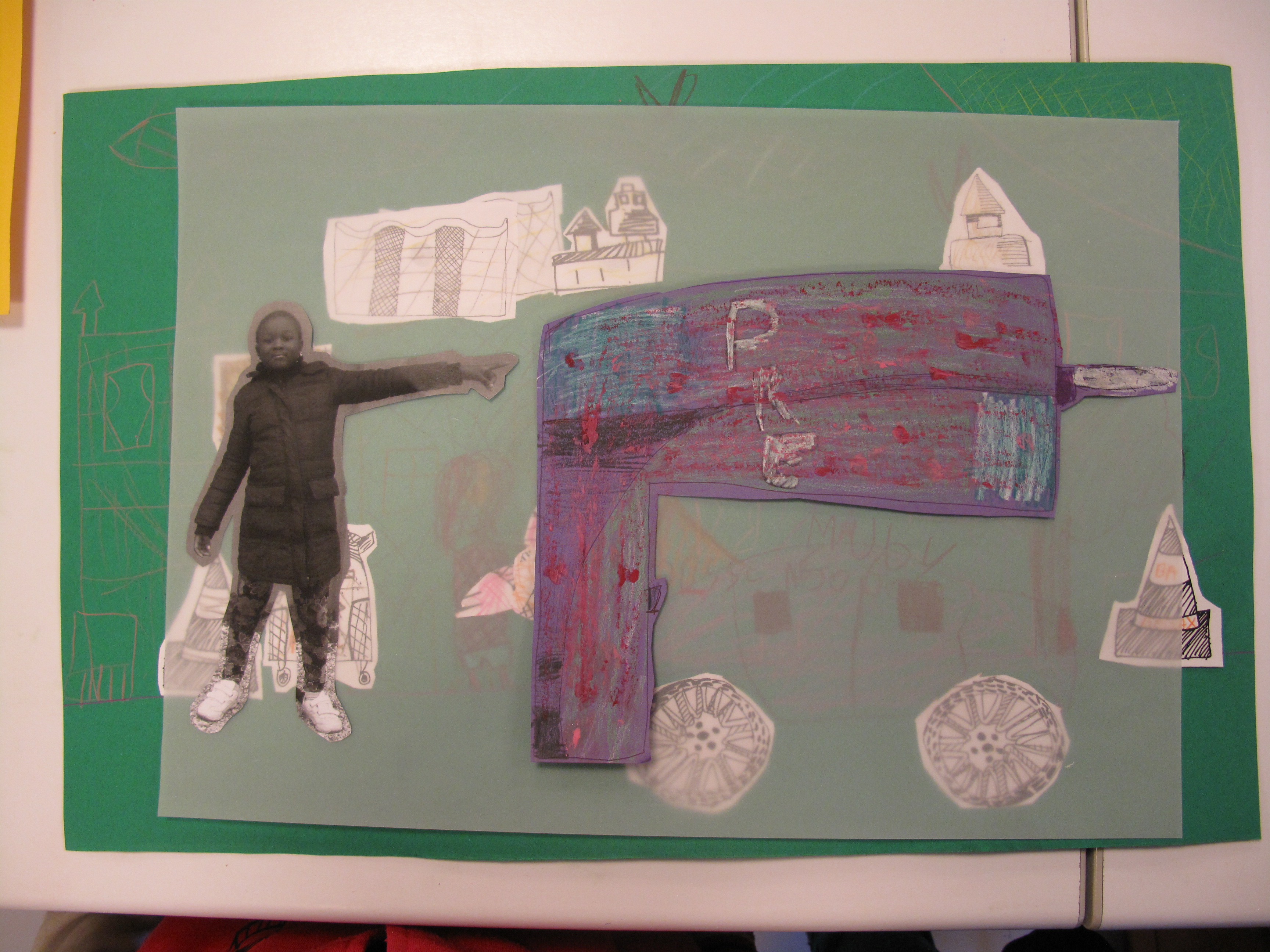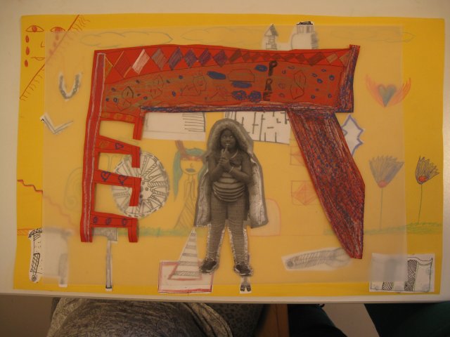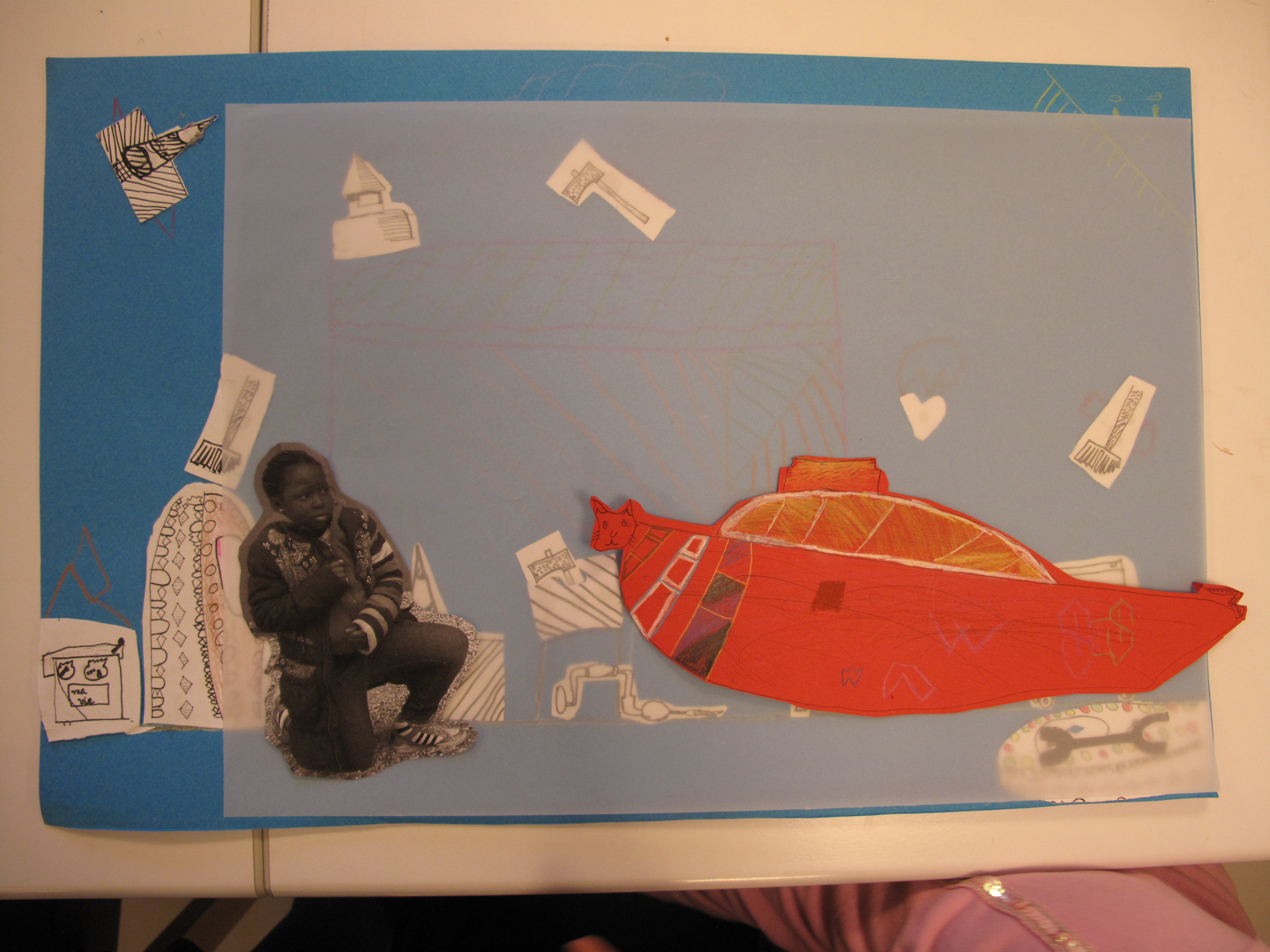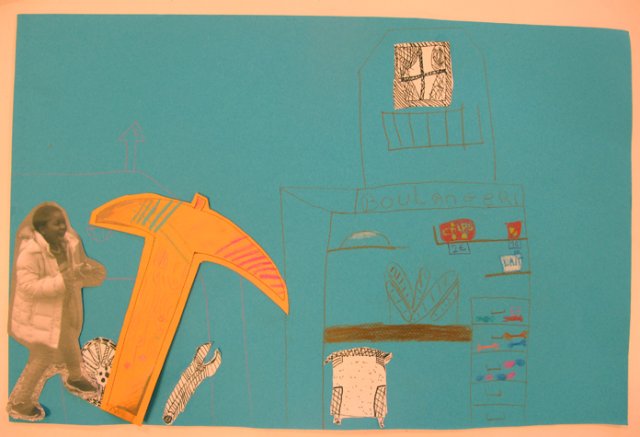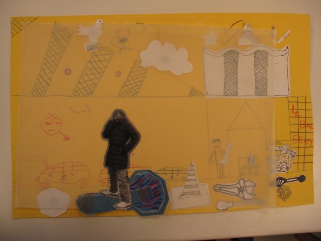 Elles doivent reprendre tous les éléments qu’elles ont dessinés, les photographies qu’elles ont prises et commencer la recherche d’une composition par superposition, dessins, agencement dans l’espace de la feuille.
