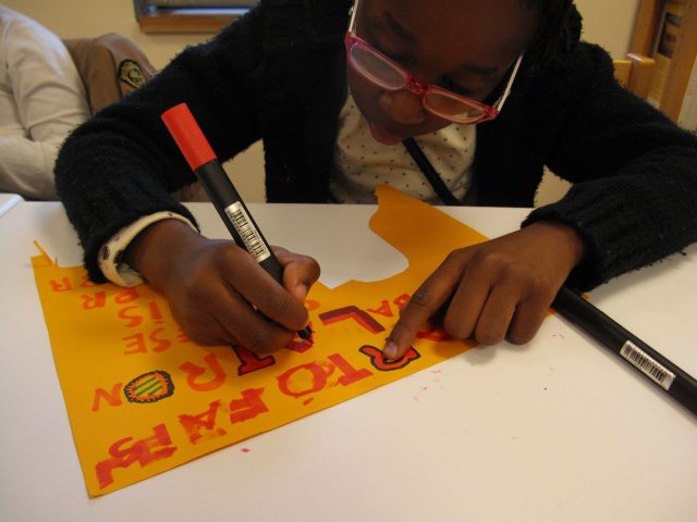 Stella leur donne des indications pour donner du relief aux lettres et les décorer.