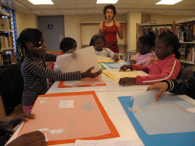 Ensuite, elle expose l’objectif de la séance : sur une feuille de canson, il faut dessiner les éléments vus sur le chantier... Ensuite découper le contour et coller le dessin sur un calque pour faire une superposition d’images, afin de s’exercer à la composition visuelle.