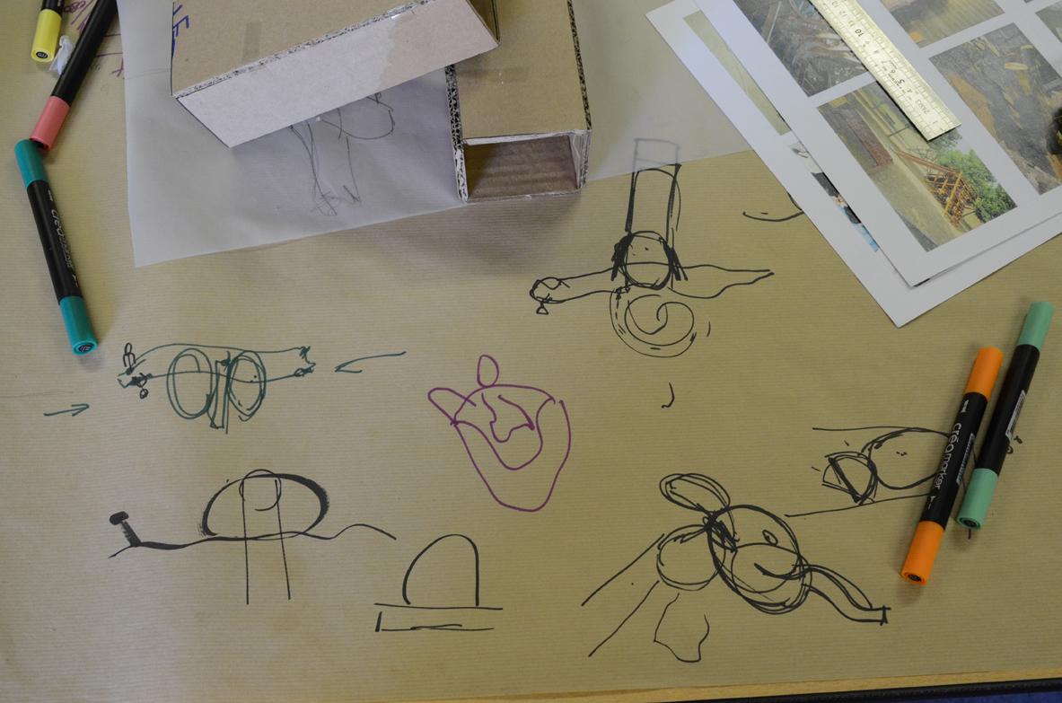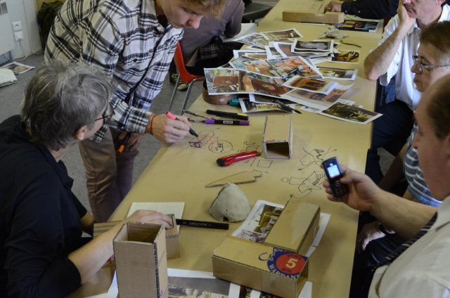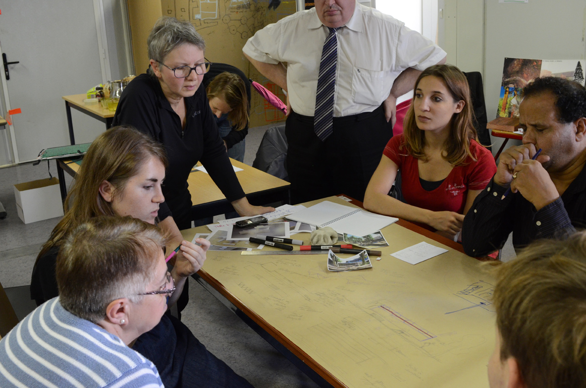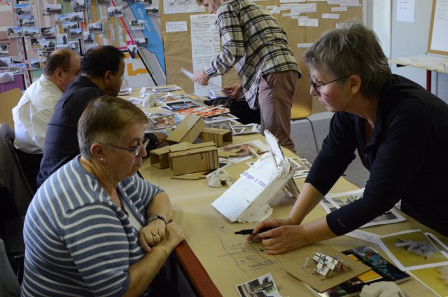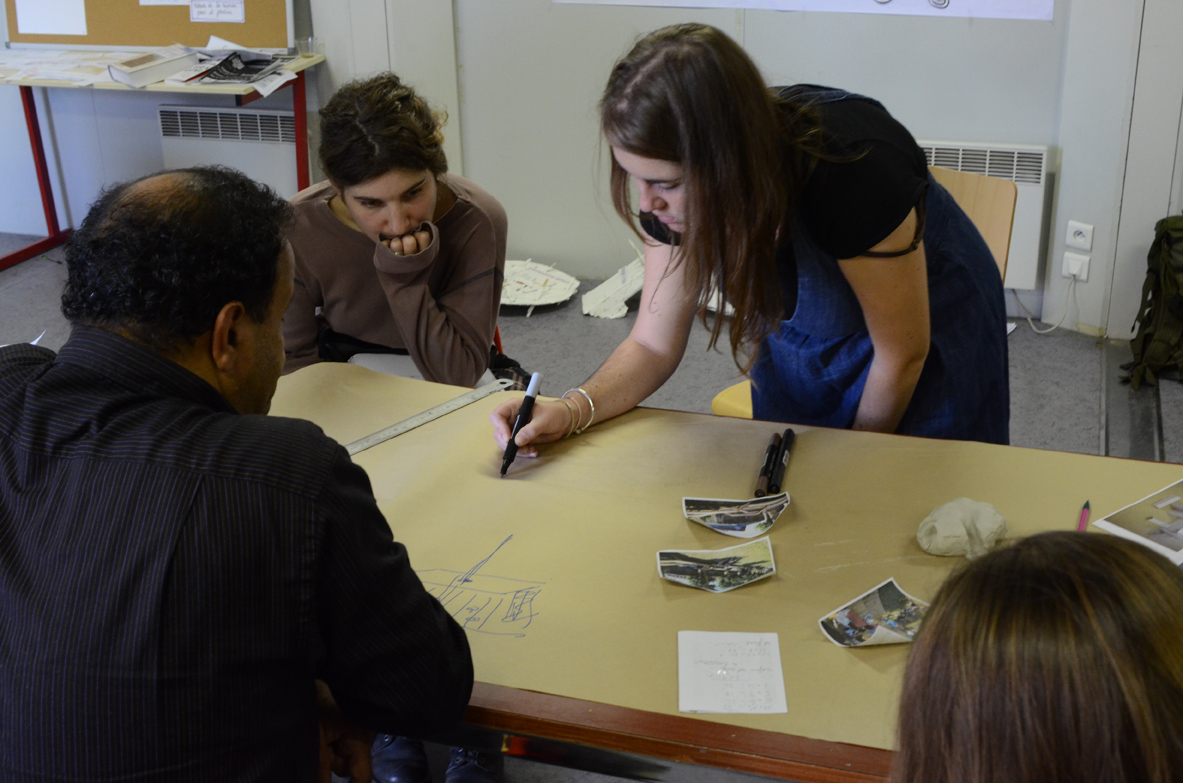 Alessandrat s’est échappée quelques heures de l’atelier de Launay pour travailler avec les habitants pendant cette 5e séance. Nous retrouvons donc le groupe des "habitués" Julia, Juliette, Madani, Mr. Rassak, Pascal et Victoire, une étudiante d’Etienne Delprat qui va intervenir sur le quartier dans les semaines qui viennent.